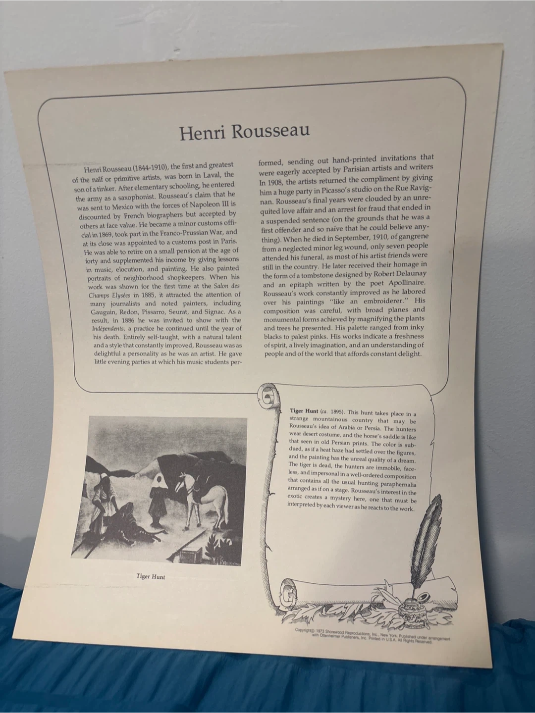 Selling an art print featuring the work of Henri Rousseau. It's a beautiful piece that captures his unique style and vision. Perfect for adding a touch of classic art to your home decor! Approx. 14” x 11”