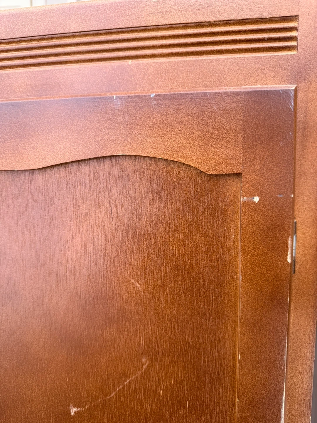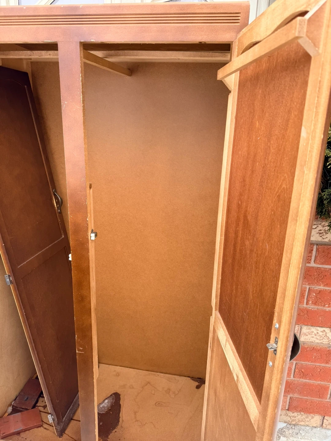 It's a classic wooden wardrobe armoire with double doors and a hanging rail inside. The wood finish is a warm brown. It's a great storage solution for a bedroom or entryway. Minor wear visible on the exterior.