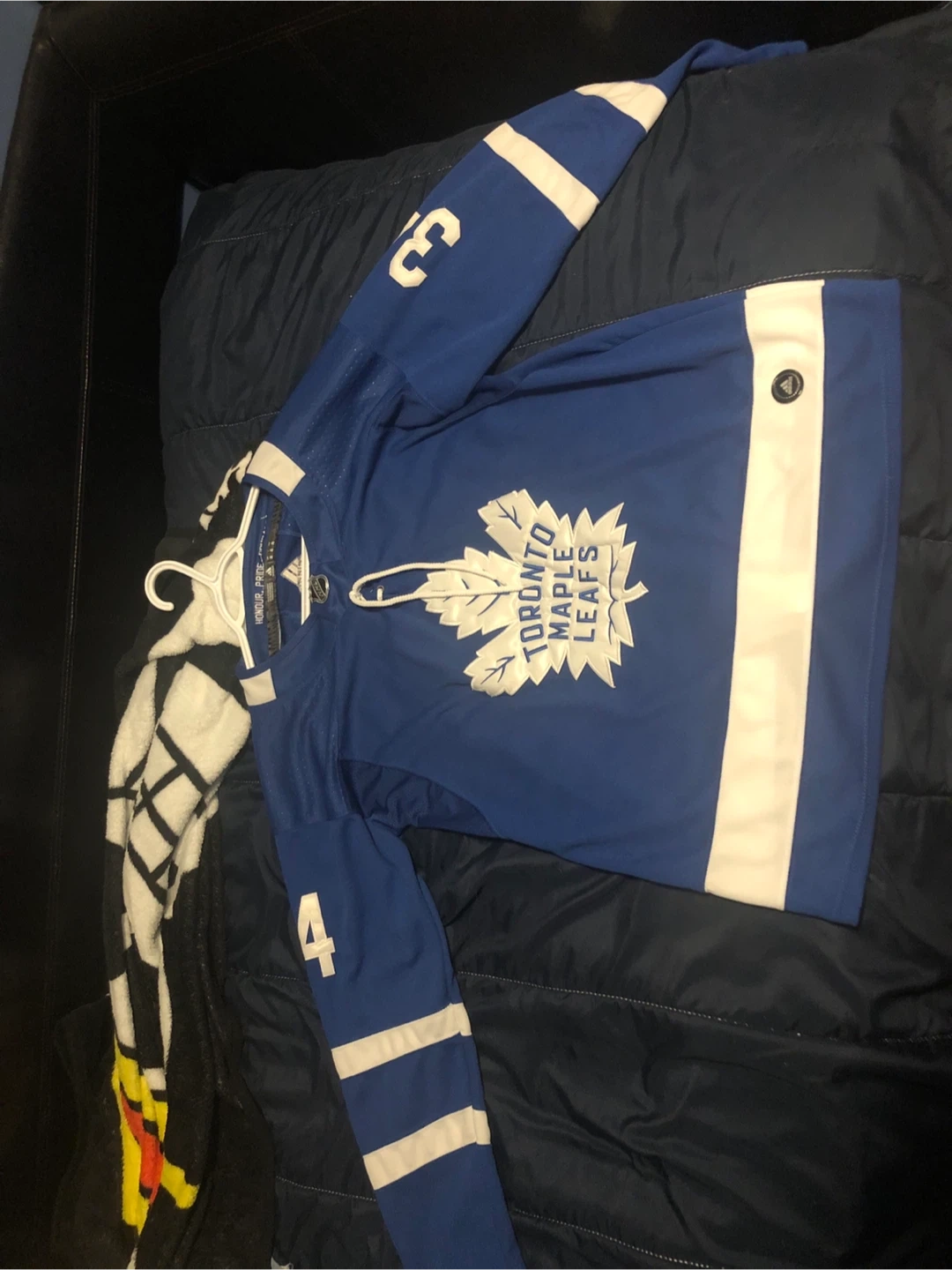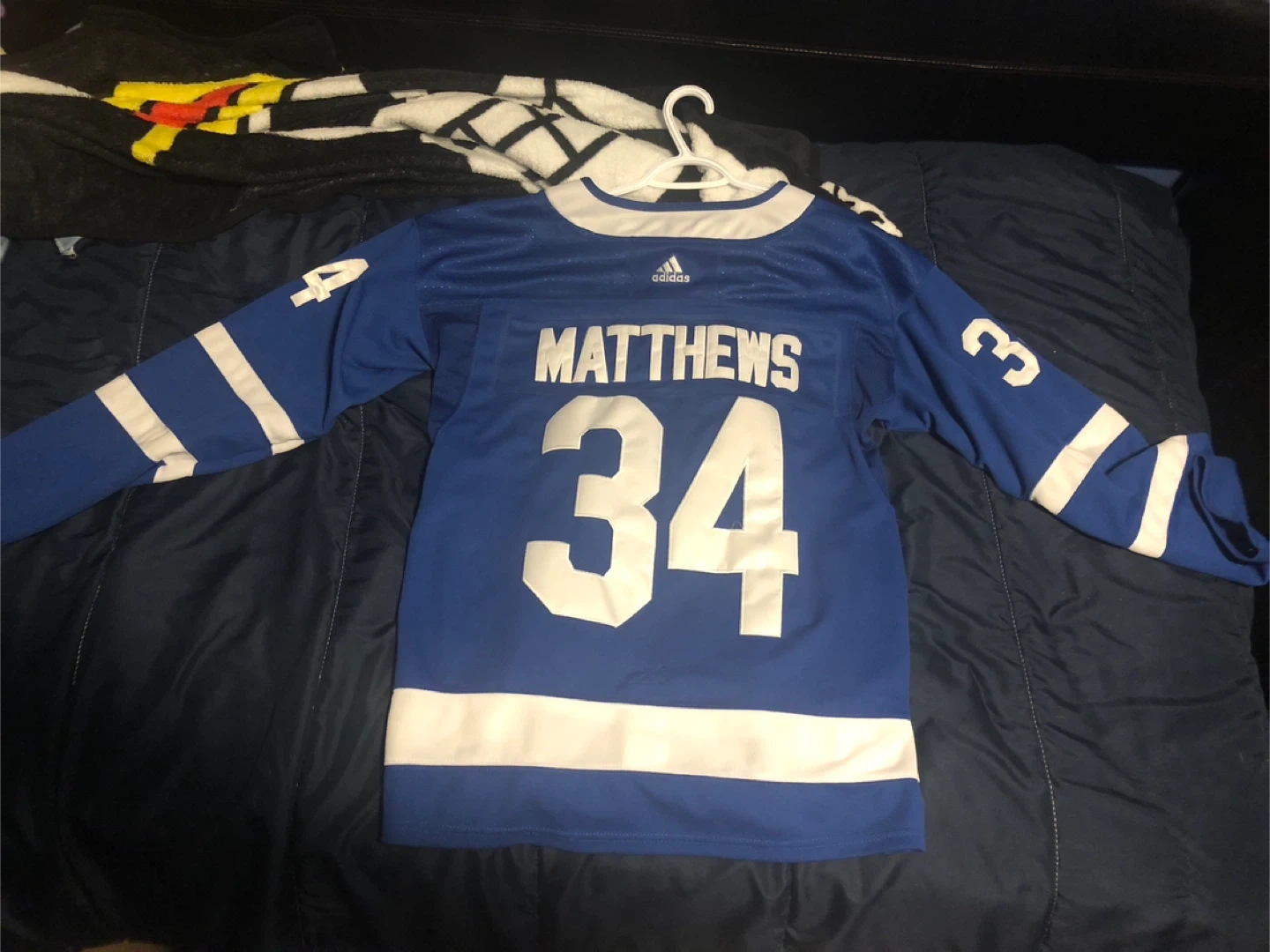This is an Adidas Toronto Maple Leafs hockey jersey. It features Auston Matthews' name and number 34. The jersey is blue with white accents and the Maple Leafs logo. It's size 46.