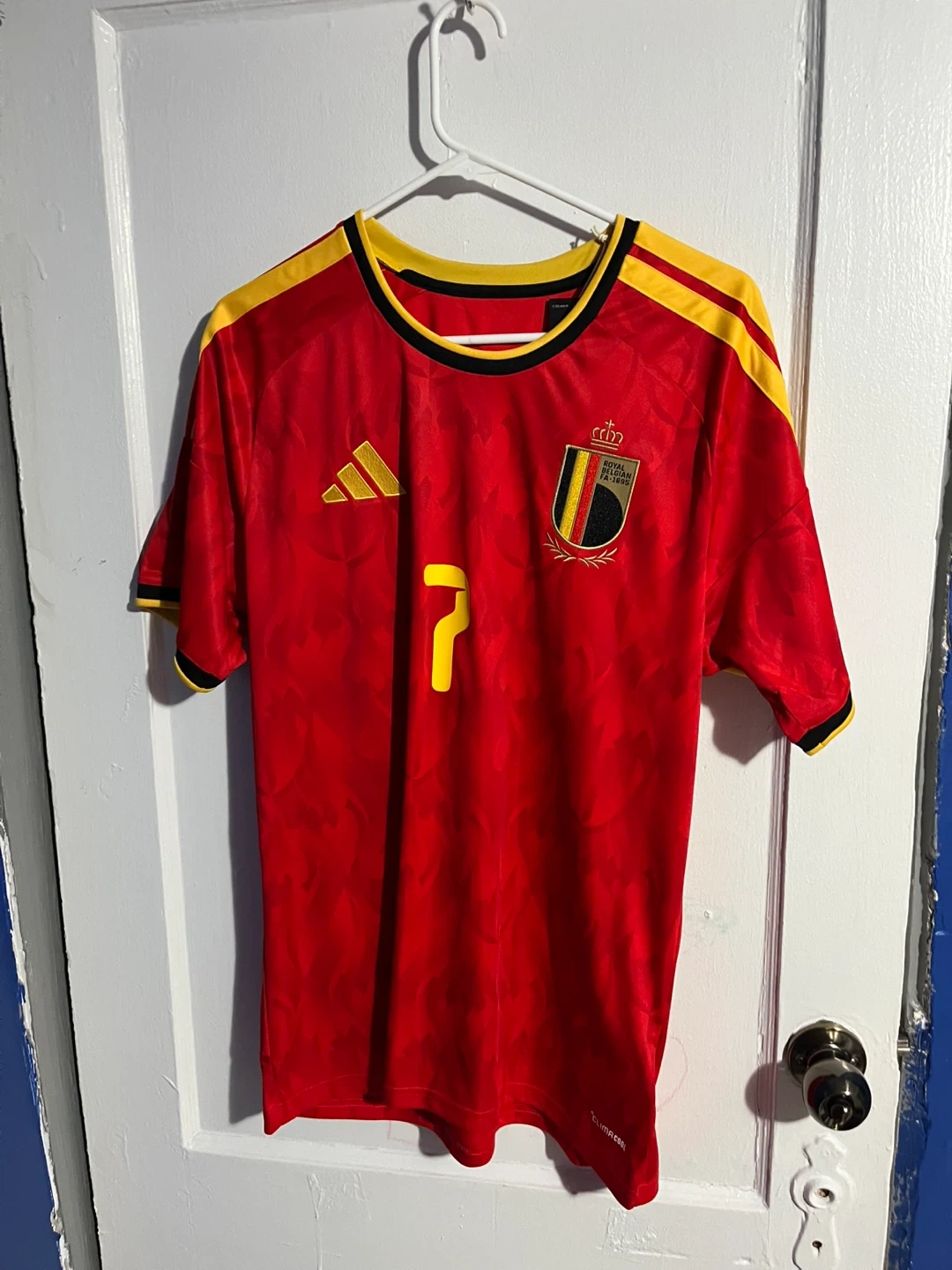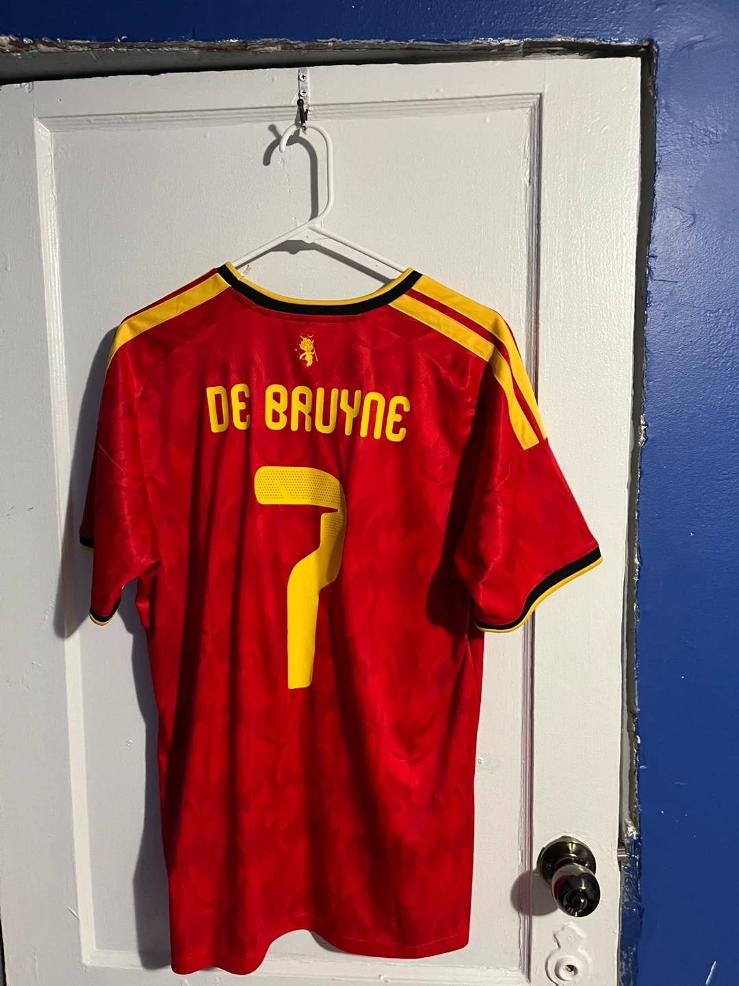 This is an Adidas Belgium national soccer team jersey. It features the name 'De Bruyne' and the number '7' on the back. The jersey is red with yellow and black accents.