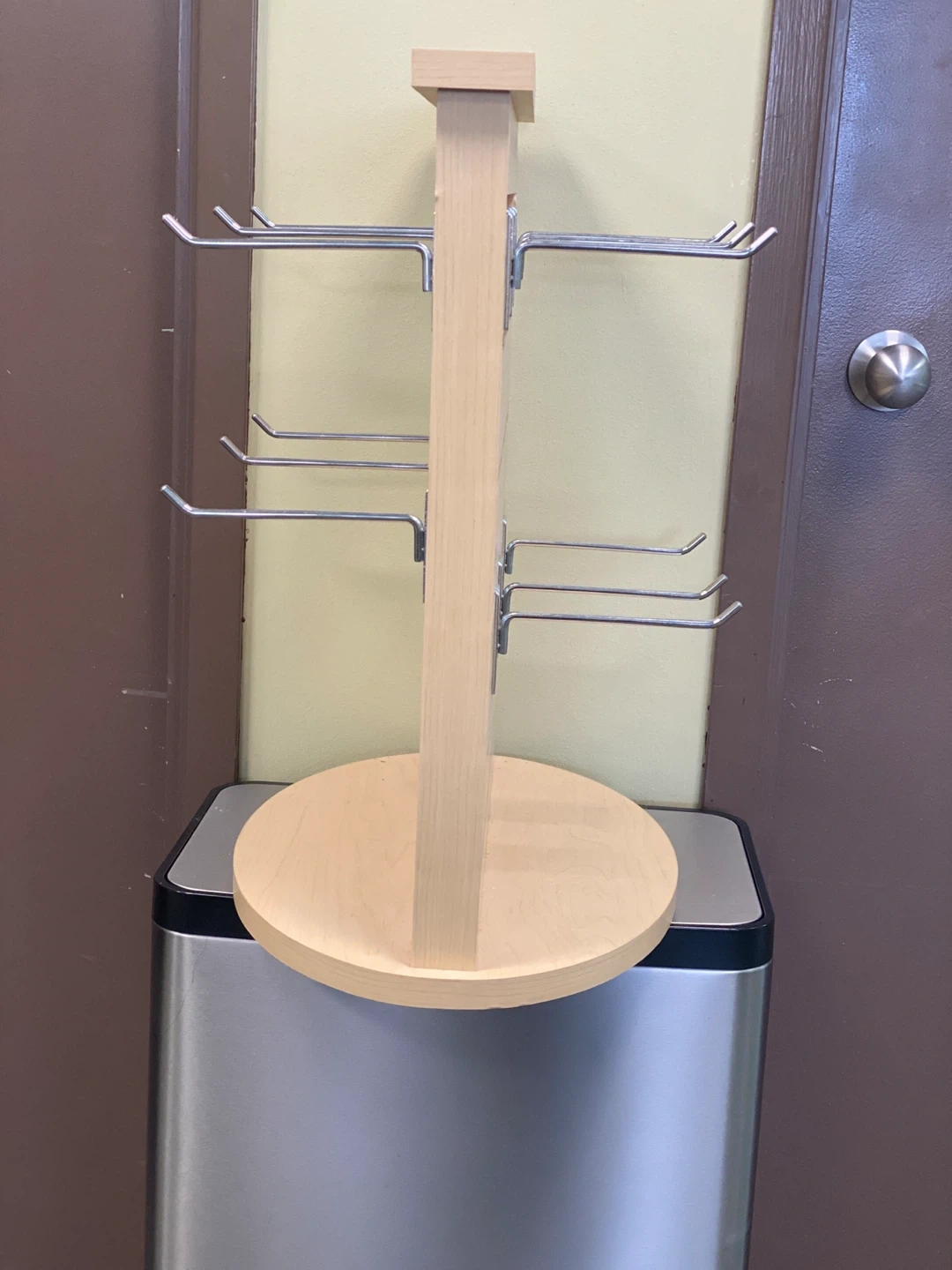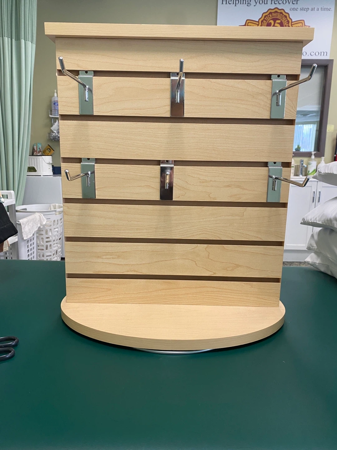 Wooden rotating display stand with multiple metal hooks. Great for small retail items or craft fairs. Stand it on your counter or table!