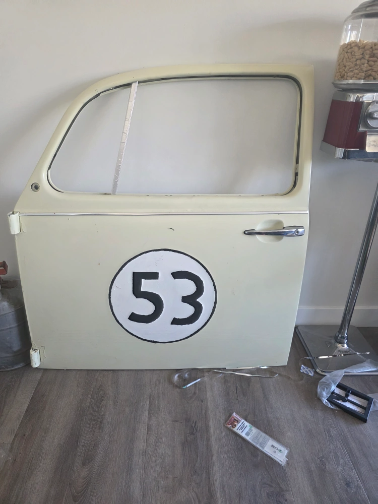 Selling a car door that looks like it's from Herbie the Love Bug! It has the number 53 on it. It appears to be from a Volkswagen Beetle. Great for a collector or someone restoring a classic car its a 1972 vw door art piece