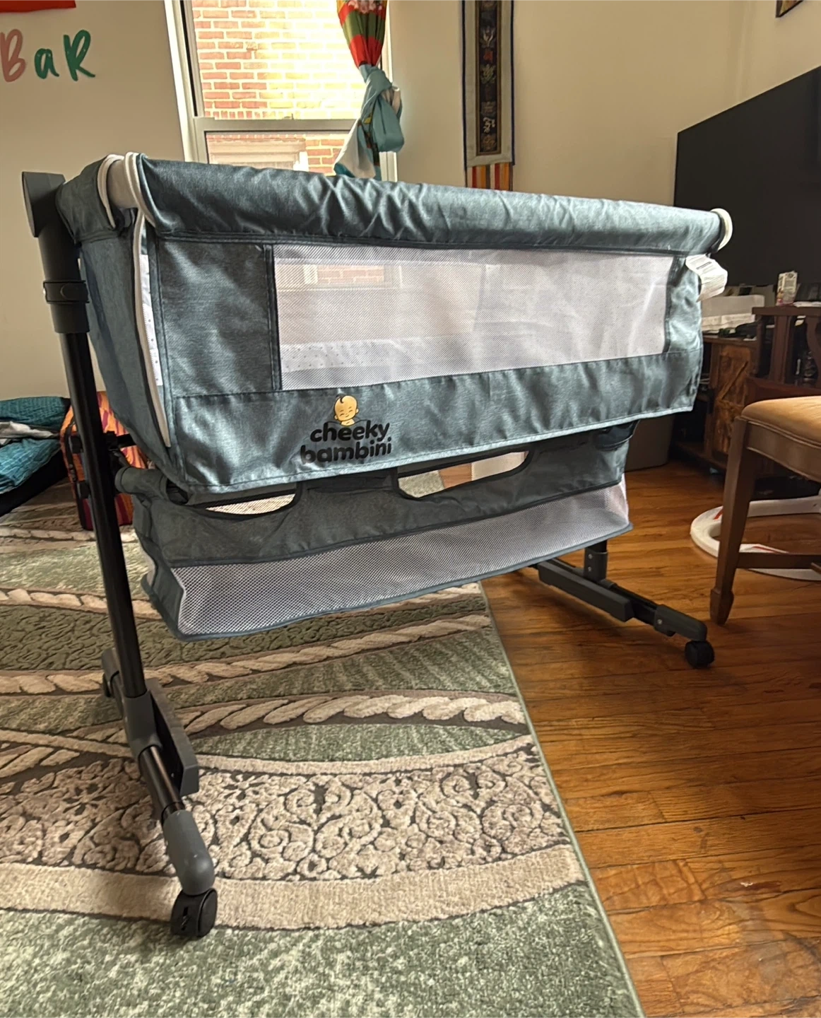 This Cheeky Bambini bassinet is a convenient co-sleeper. It features a mesh window for breathability and adjustable height. Perfect for keeping your baby close by at night!