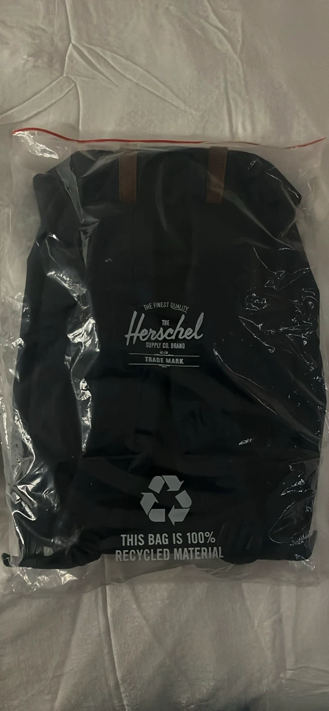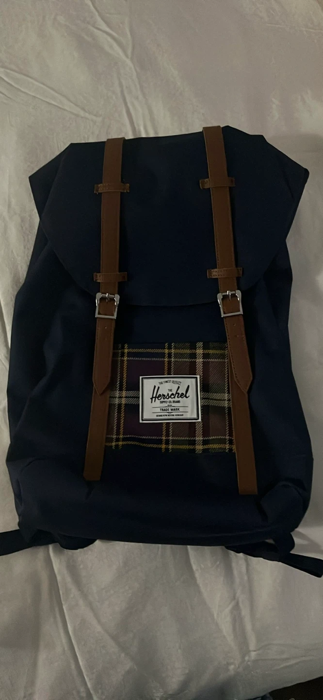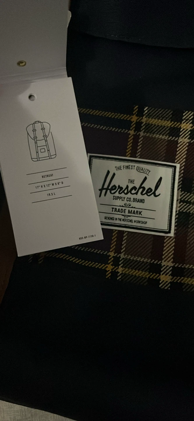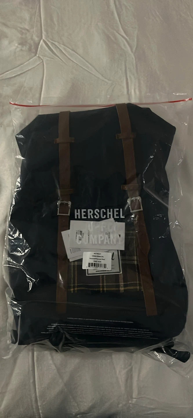 57Selling a brand new Herschel Retreat backpack! It's navy with tan straps and a plaid accent. - Dimensions: 17" H x 13" W x 6" D - Volume: 18.5 L - Made with 100% recycled material Never been used and still in the original packaging