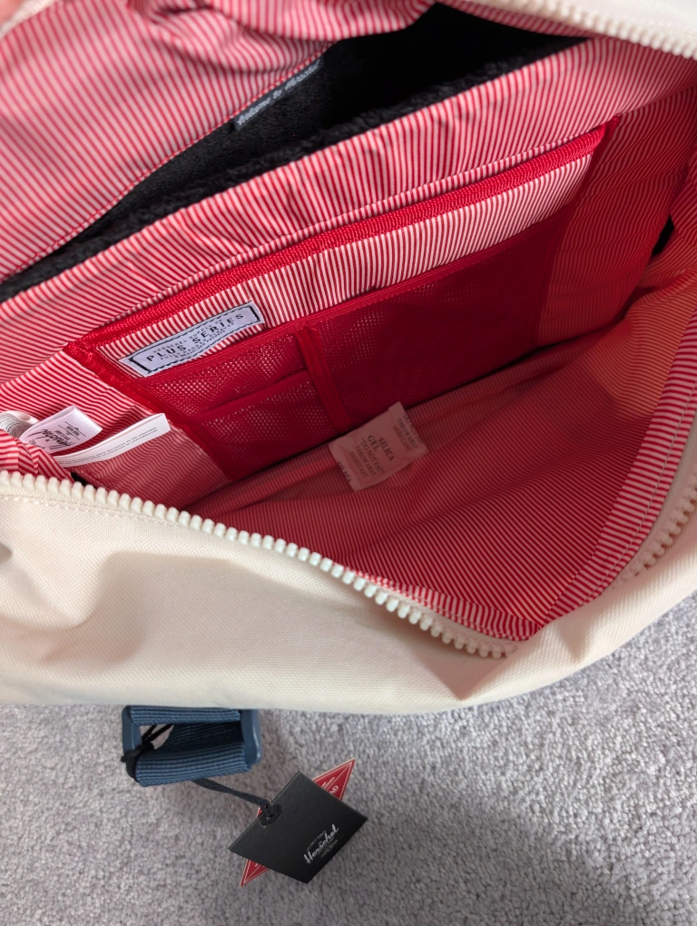 Brand new Herschel Strand Plus duffle bag - has interior features to fit laptop, tablet, phone. This is brand new with tags still attached. Size: 13.5 H x 16.5 W x 5.5 D