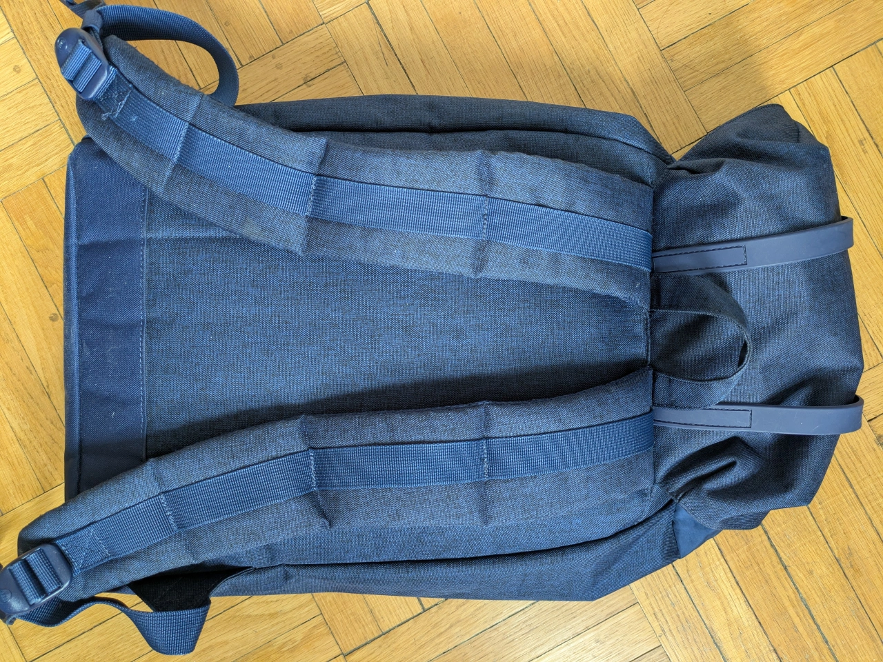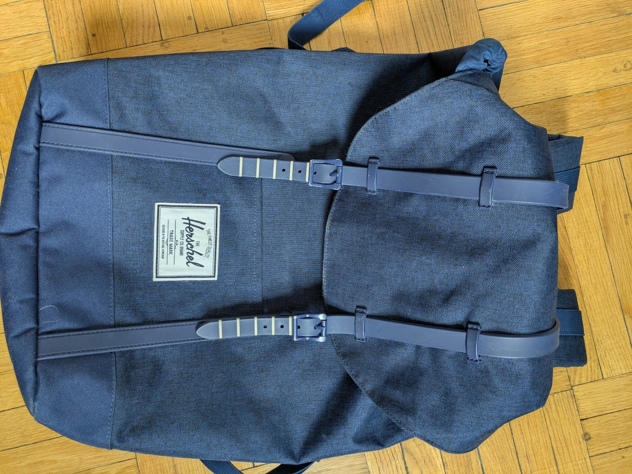 Blue unisex backpack with a drawstring closure and multiple pockets (one at the front and the other internal for a laptop). The interior has a red and white striped lining. Gently used and in excellent condition.