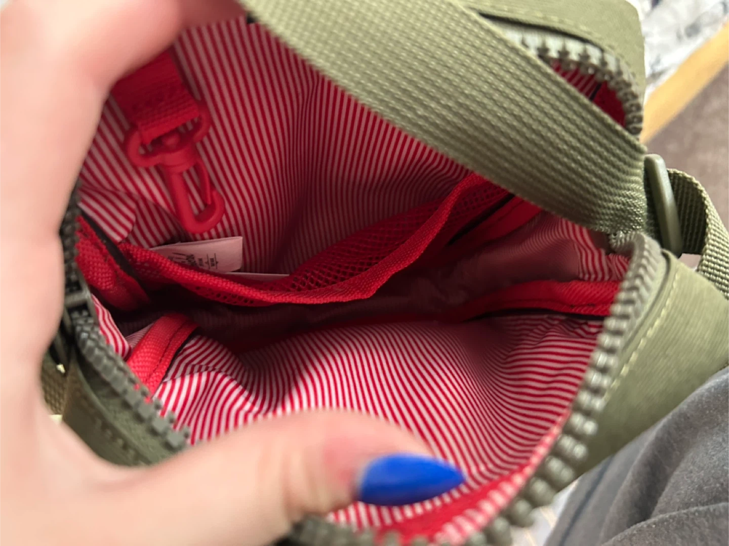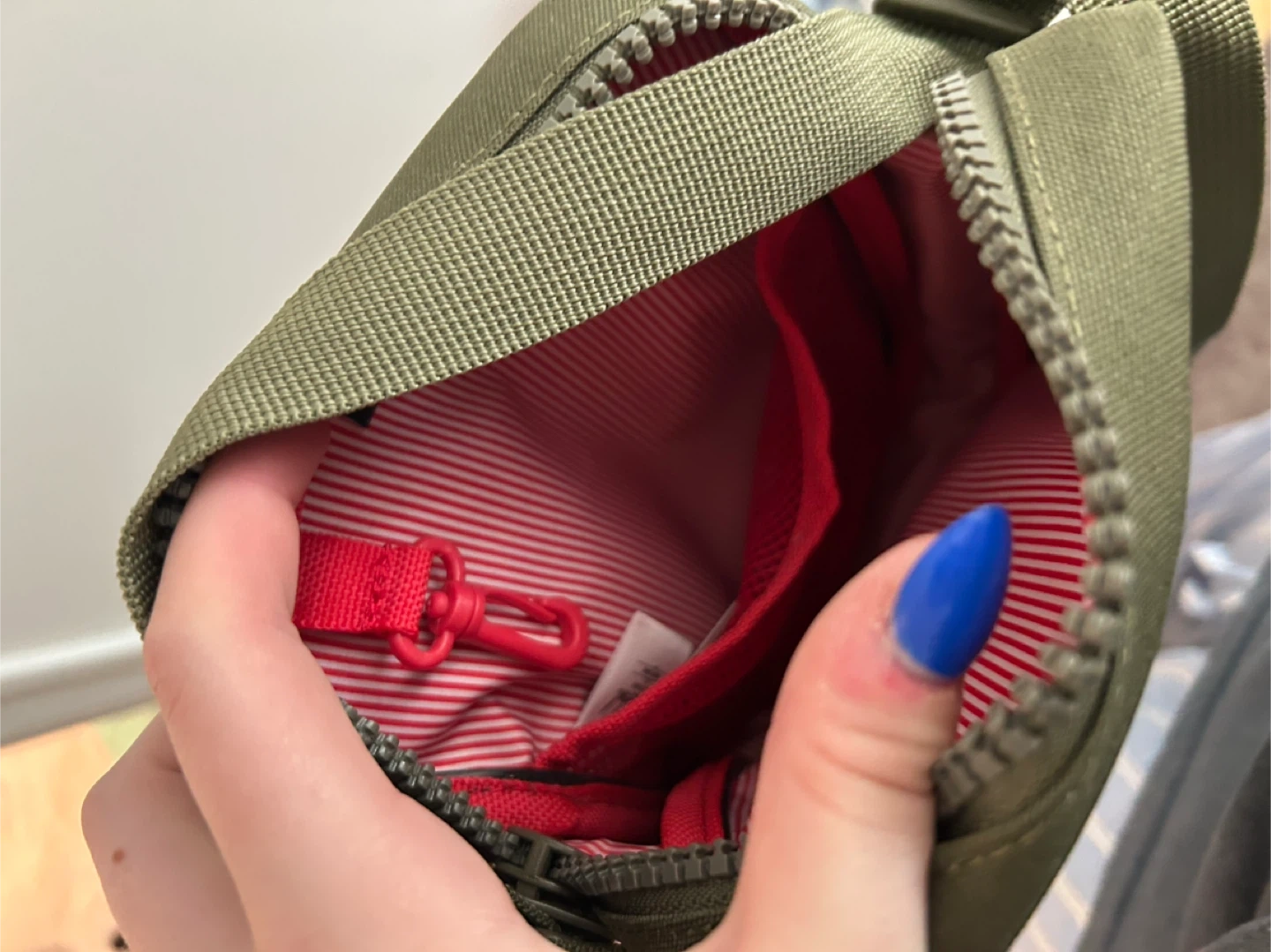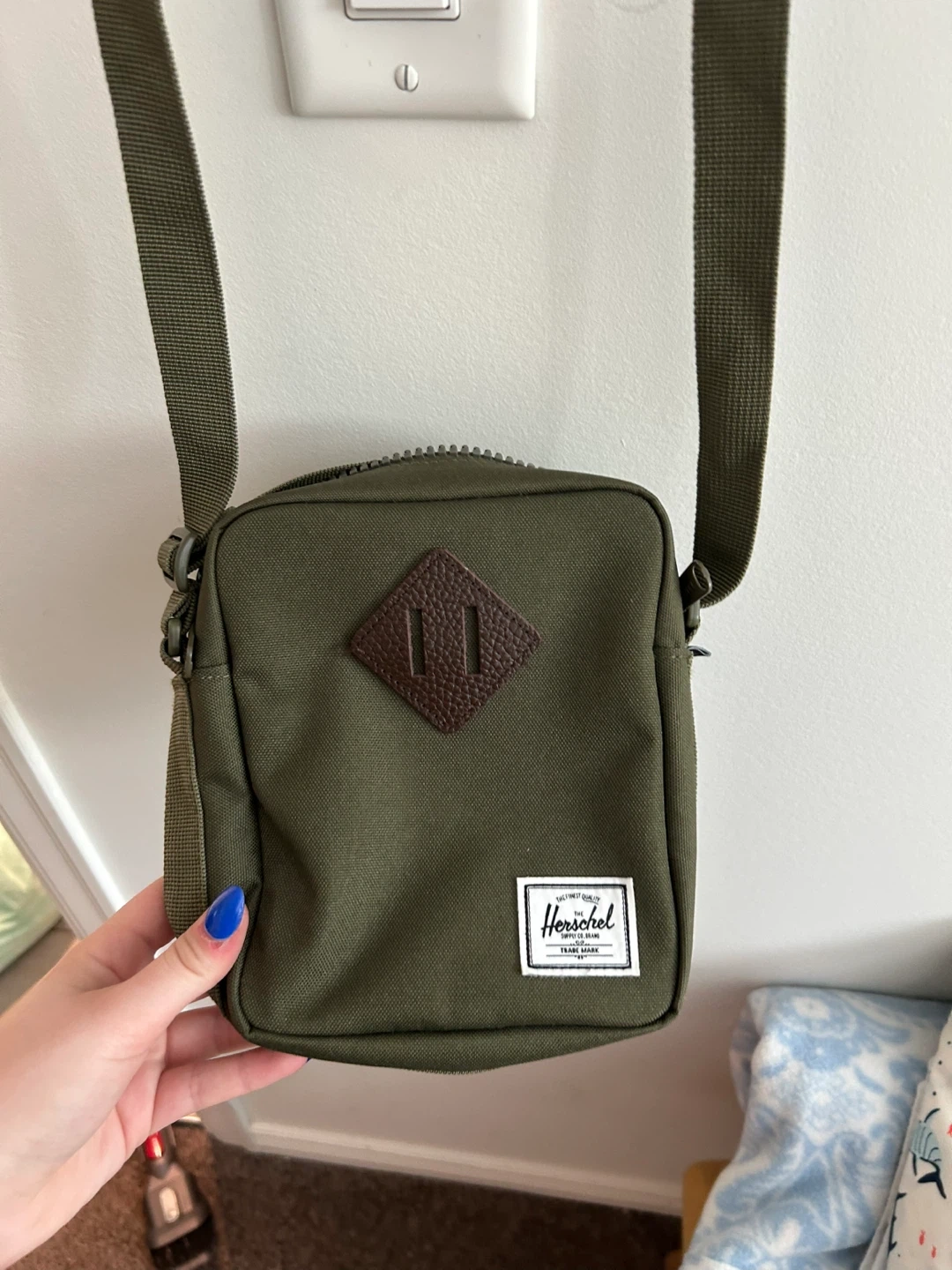 Looking to sell this Herschel Supply Co. crossbody bag in olive green! It's in great condition and features a red and white striped interior lining. Perfect for carrying your essentials on the go!