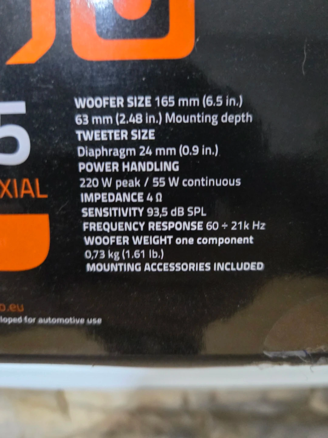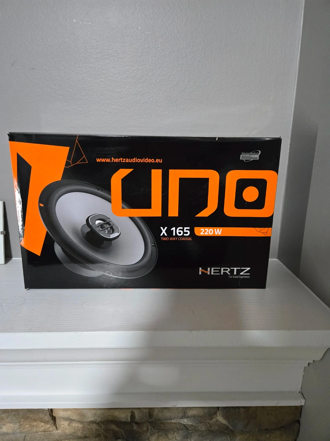 60Selling a brand new Hertz Uno X 165 two-way coaxial speaker! Key features: - Woofer size: 165 mm (6.5 in) - Mounting depth: 63 mm (2.48 in) - Tweeter diaphragm: 24 mm (0.9 in) - Power handling: 220 W peak / 55 W continuous - Impedance: 4Ω - Sensitivity: 93,5 dB SPL - Frequency response: 60 ÷ 21k Hz - Woofer weight: 0,73 kg (1.61 lb) Mounting accessories are included, and the original box is included