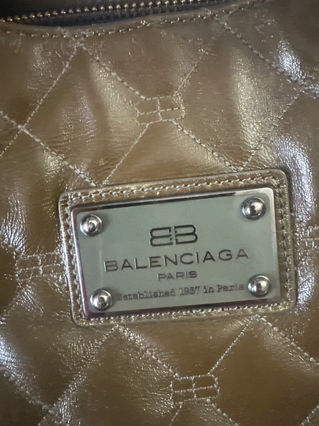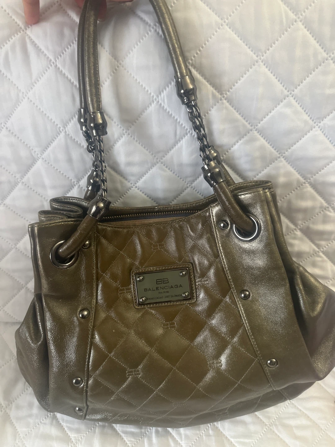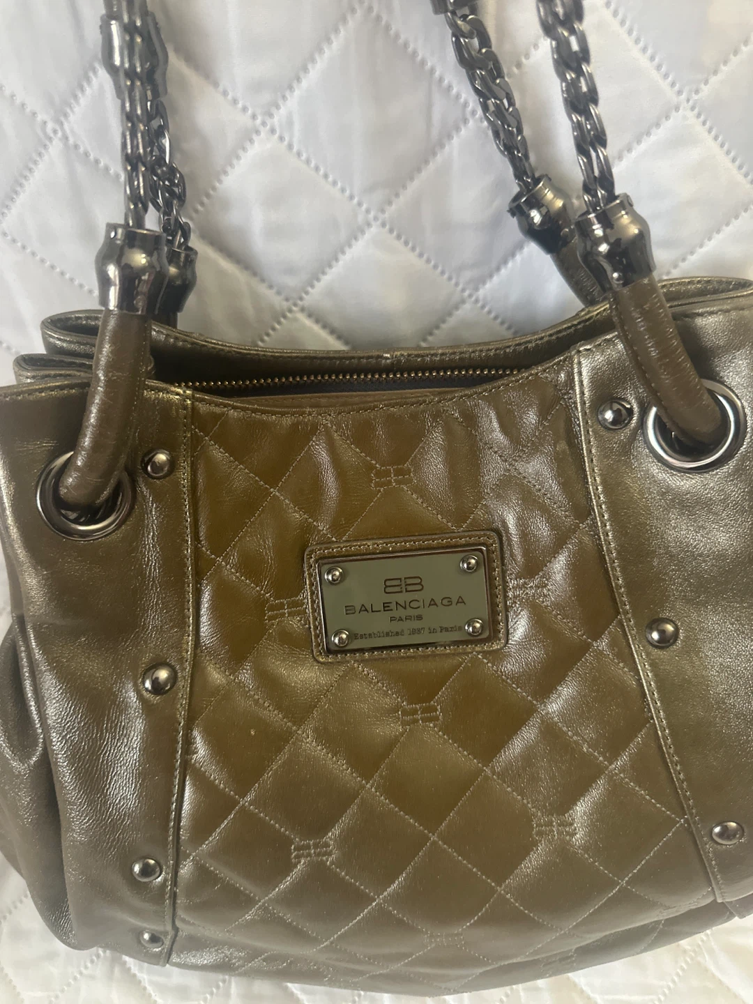 Balenciaga Paris quilted handbag in a metallic olive colour. It has dual chain and leather straps. Established 1917 in Paris.