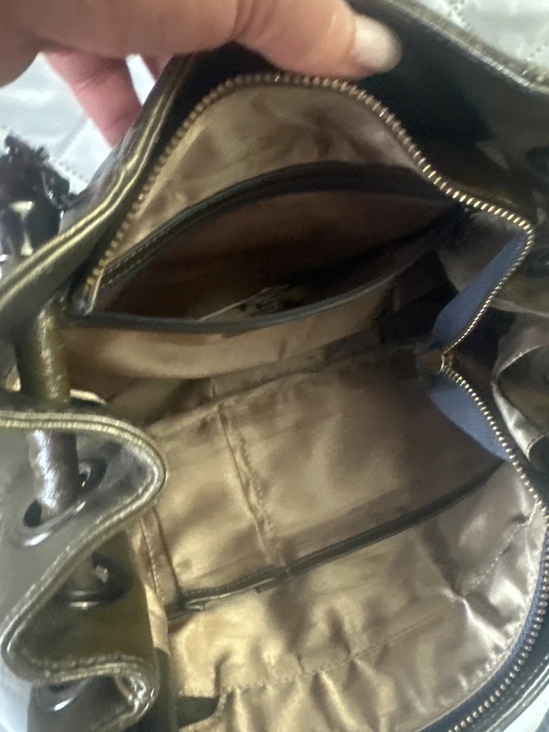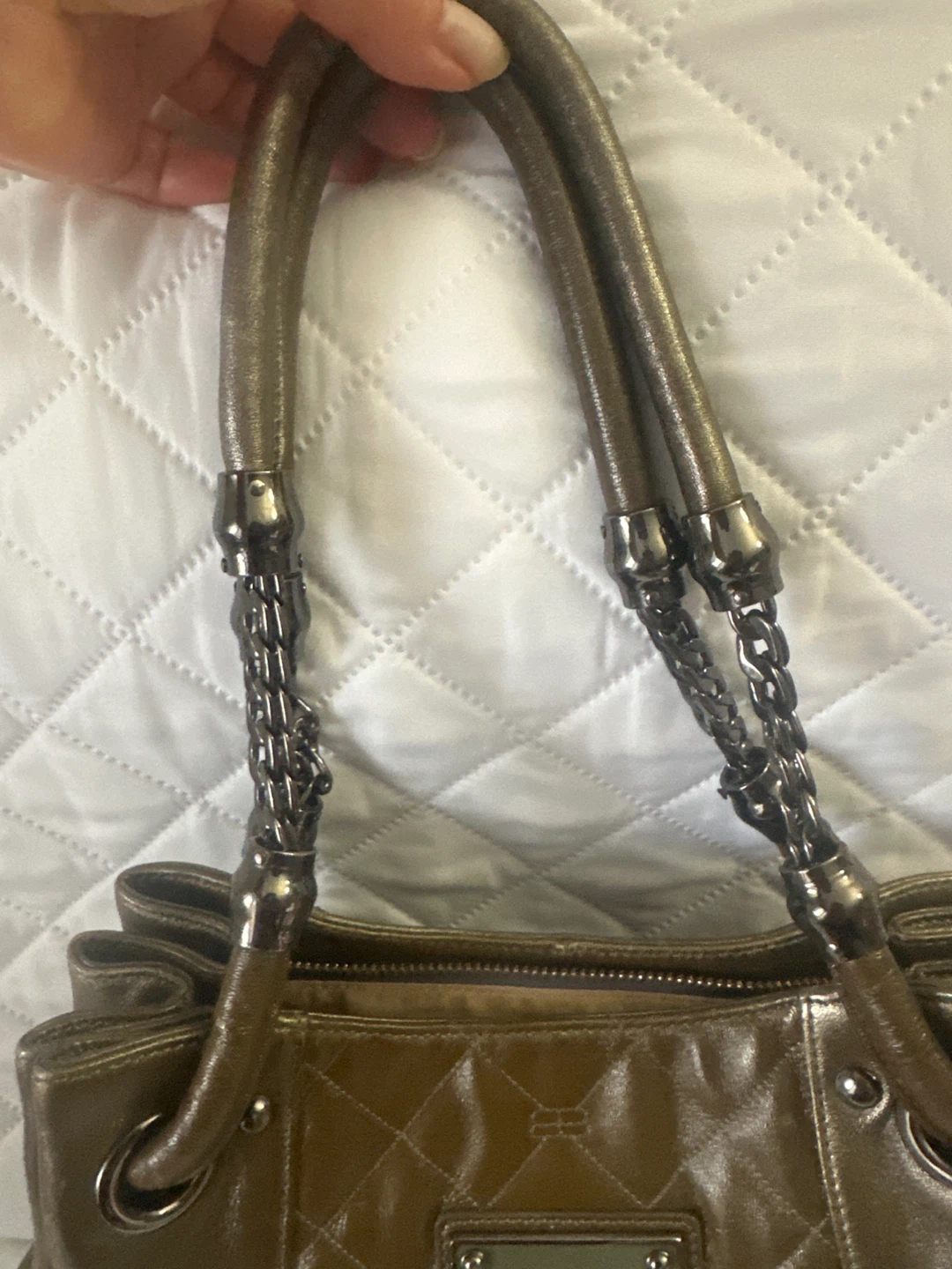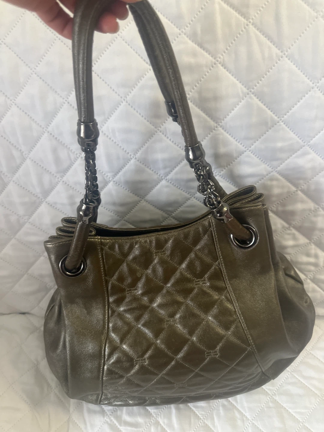 Balenciaga Paris quilted handbag in a metallic olive colour. It has dual chain and leather straps. Established 1917 in Paris.