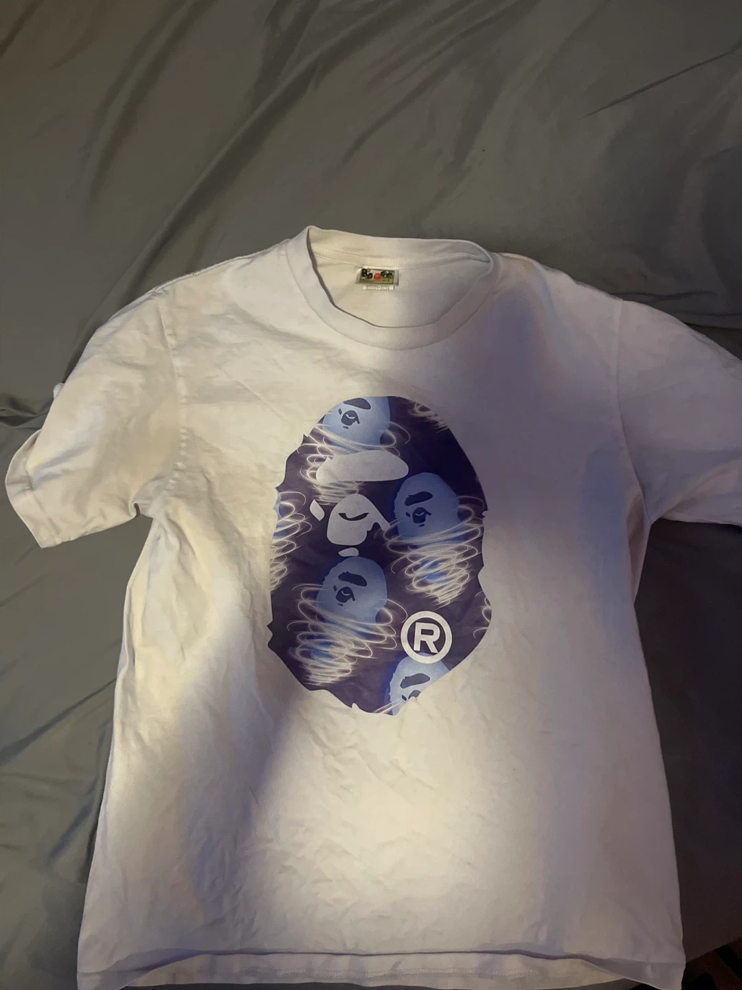 White A Bathing Ape (BAPE) t-shirt featuring a prominent graphic print on the front. This tee showcases the iconic ape head logo with multiple blue ape faces in a swirling pattern. Made from comfortable cotton material.