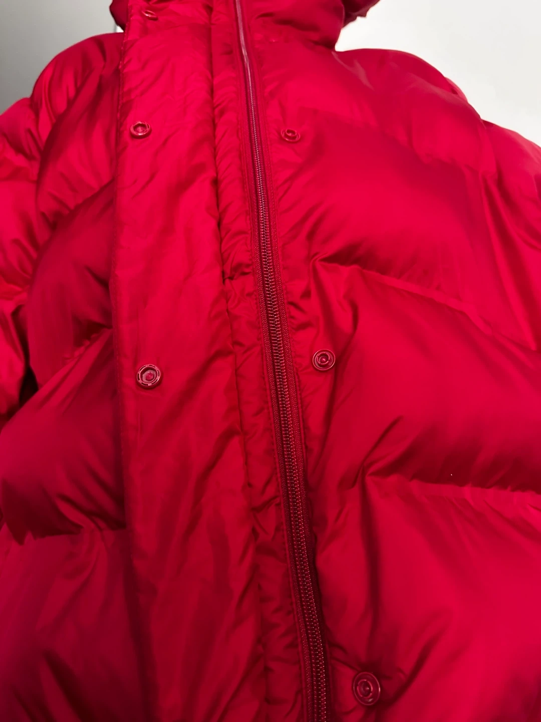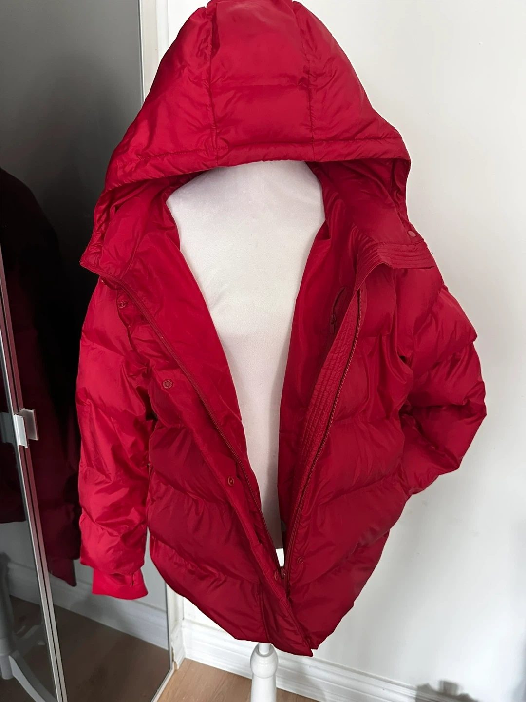 Cozy red puffer jacket with a hood. It's fully lined with a zip and snap closure. Side pockets included for convenience. This jacket is great for chilly weather!