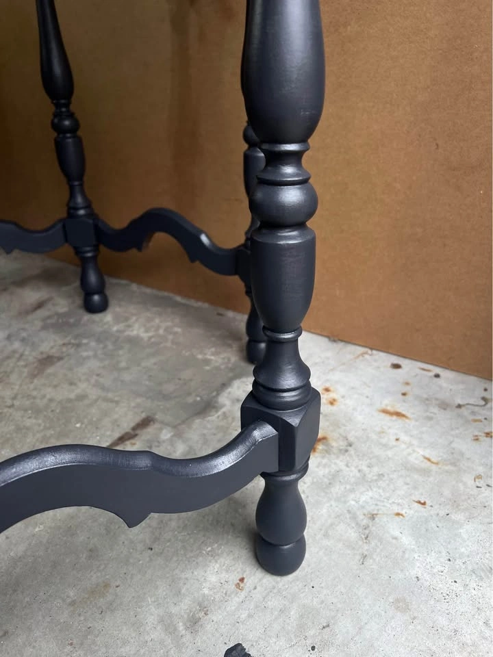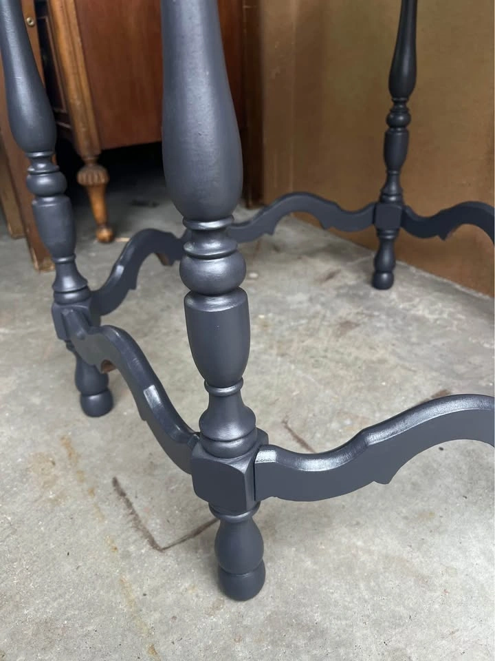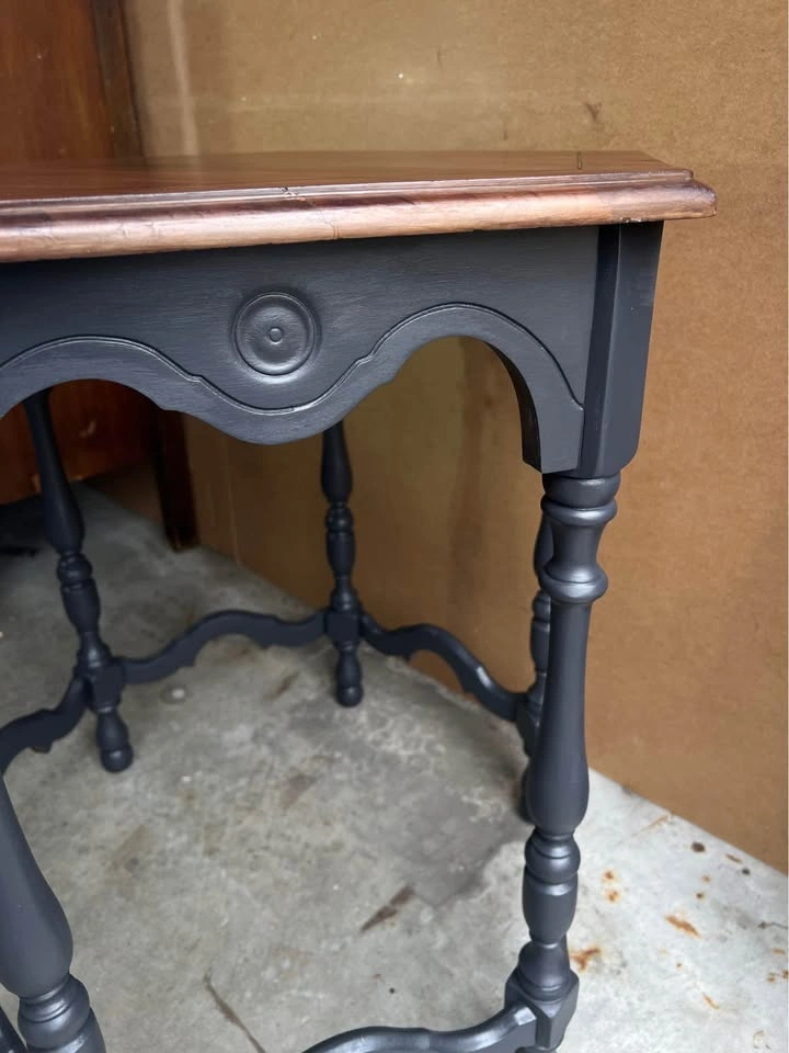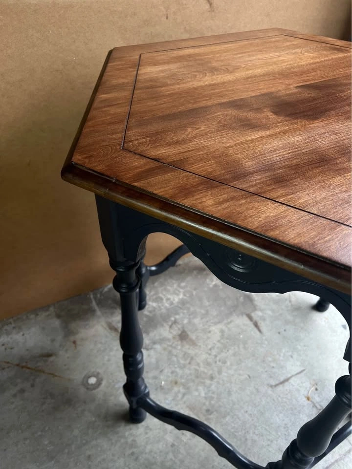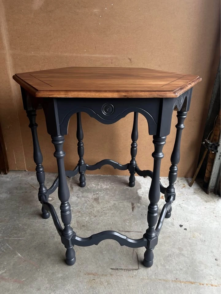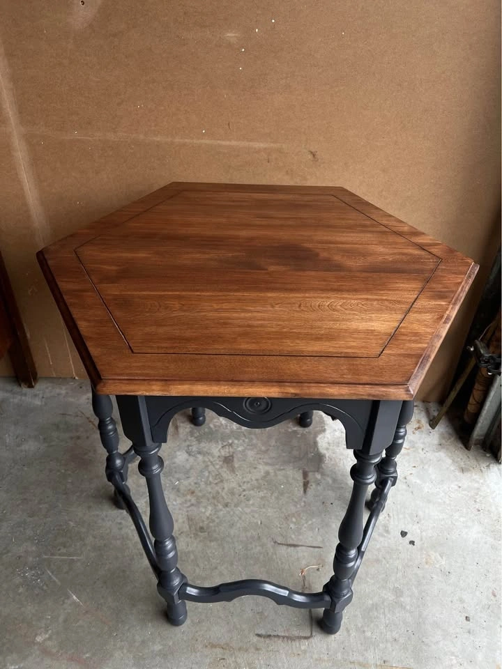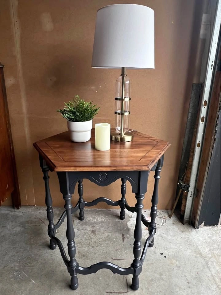 28This unique hexagon side table has been beautifully refinished to bring out its timeless charm. The top has been sanded and stained to highlight the warm natural wood grain, while the base has been updated in a sleek dark grey for a modern touch. Perfect for a cozy reading nook, beside a sofa, or as an accent piece in any room. Its sturdy build and elegant turned legs give it both character and durability. Dimensions: Height: 29.5 inc Width: 31.5 inc Restored by Flourish Home Creations Pickup in (Keswick).