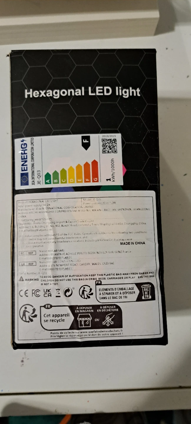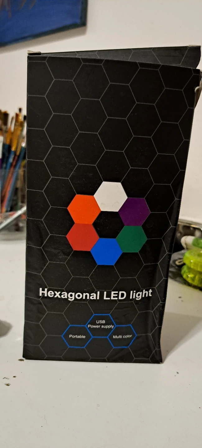 10Selling a new (never used) Hexagonal LED light set, still in its original box containing 6 lights, wall adhesives, usb power supply, connecting pieces and instructions. This light features multiple control options, including WiFi, IR remote, touch sensitivity, and APP control. It is in perfect condition and works as great decor! (Note: the lights only light up as white, and the box has water damage but none of the lights were affected).