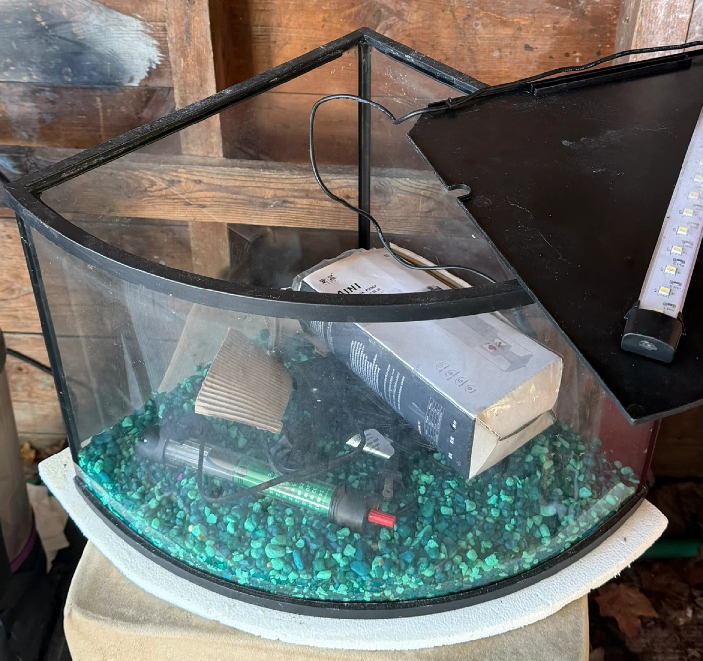 Selling a corner fish tank that comes with gravel, a heater, and an LED light bar. It's all ready to go for your aquatic friends!