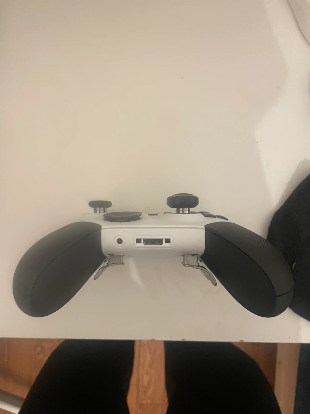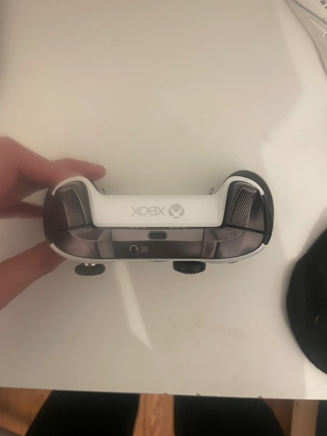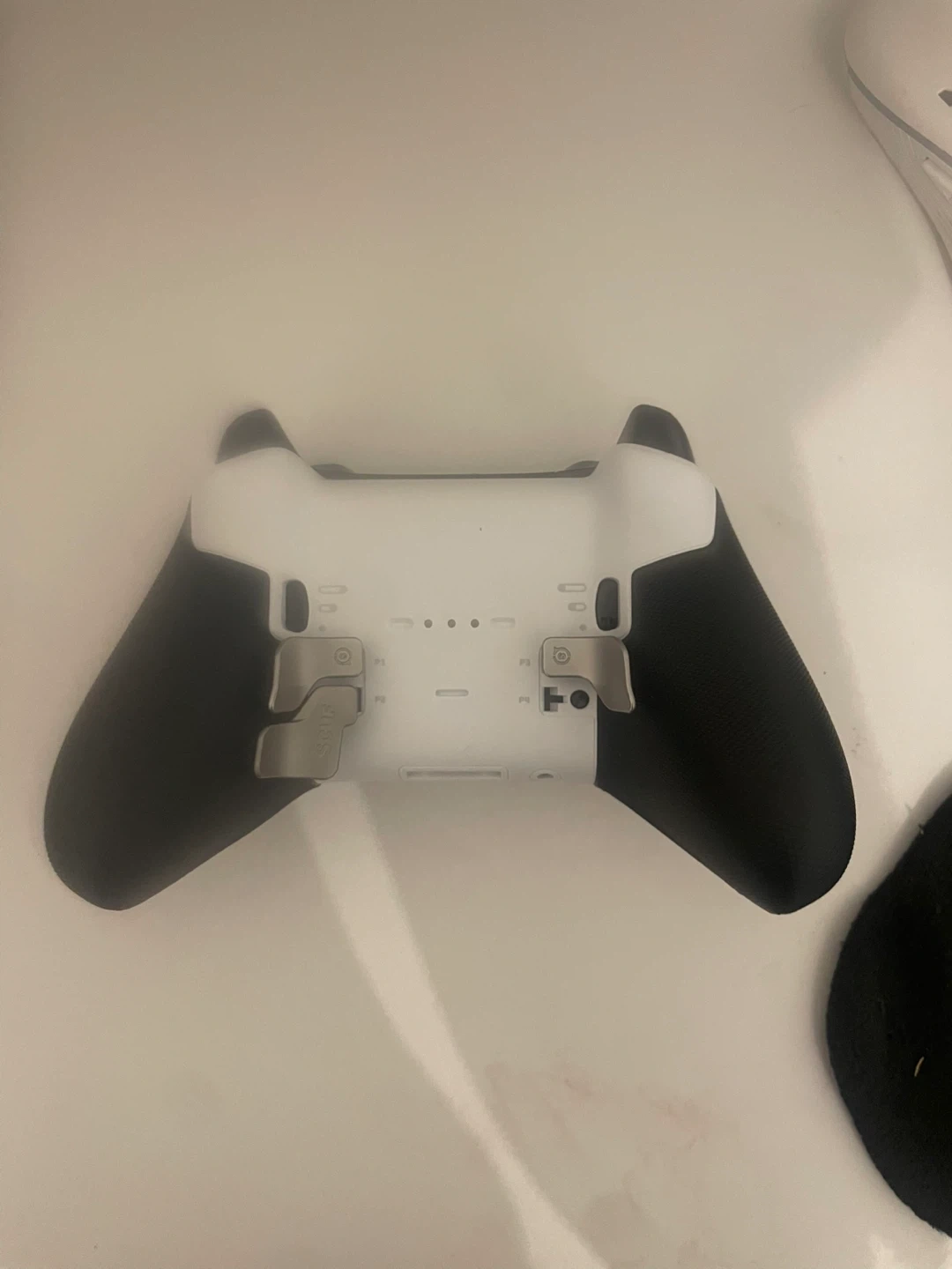 Xbox Elite Wireless Controller Series 2 in white. Features textured grips and customizable back buttons and trigger stoppers.