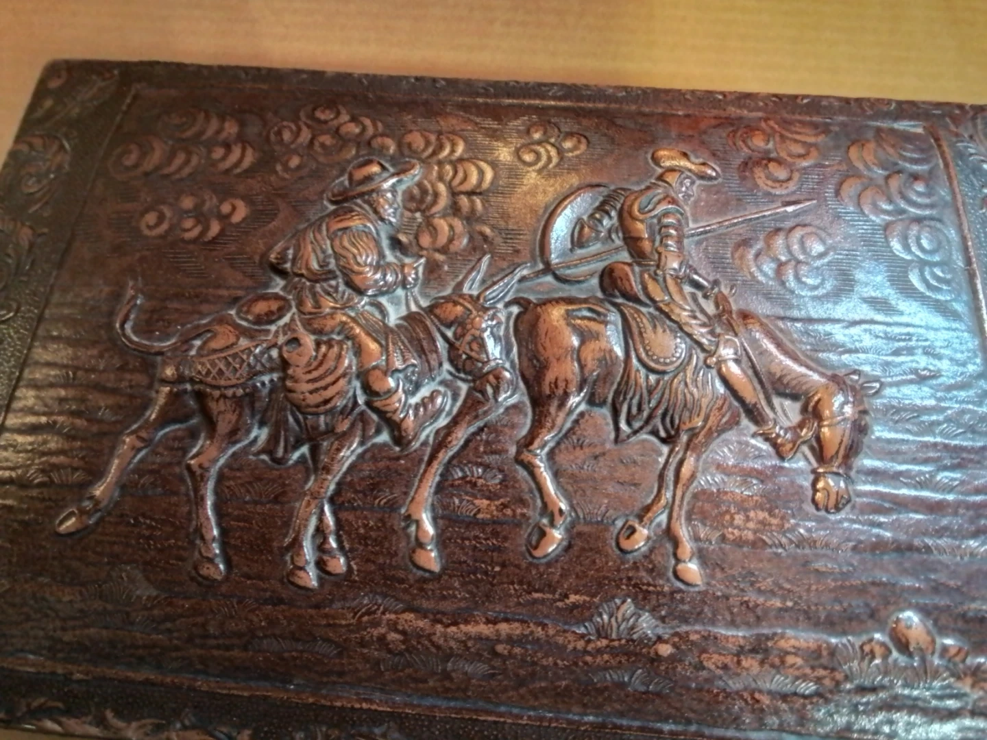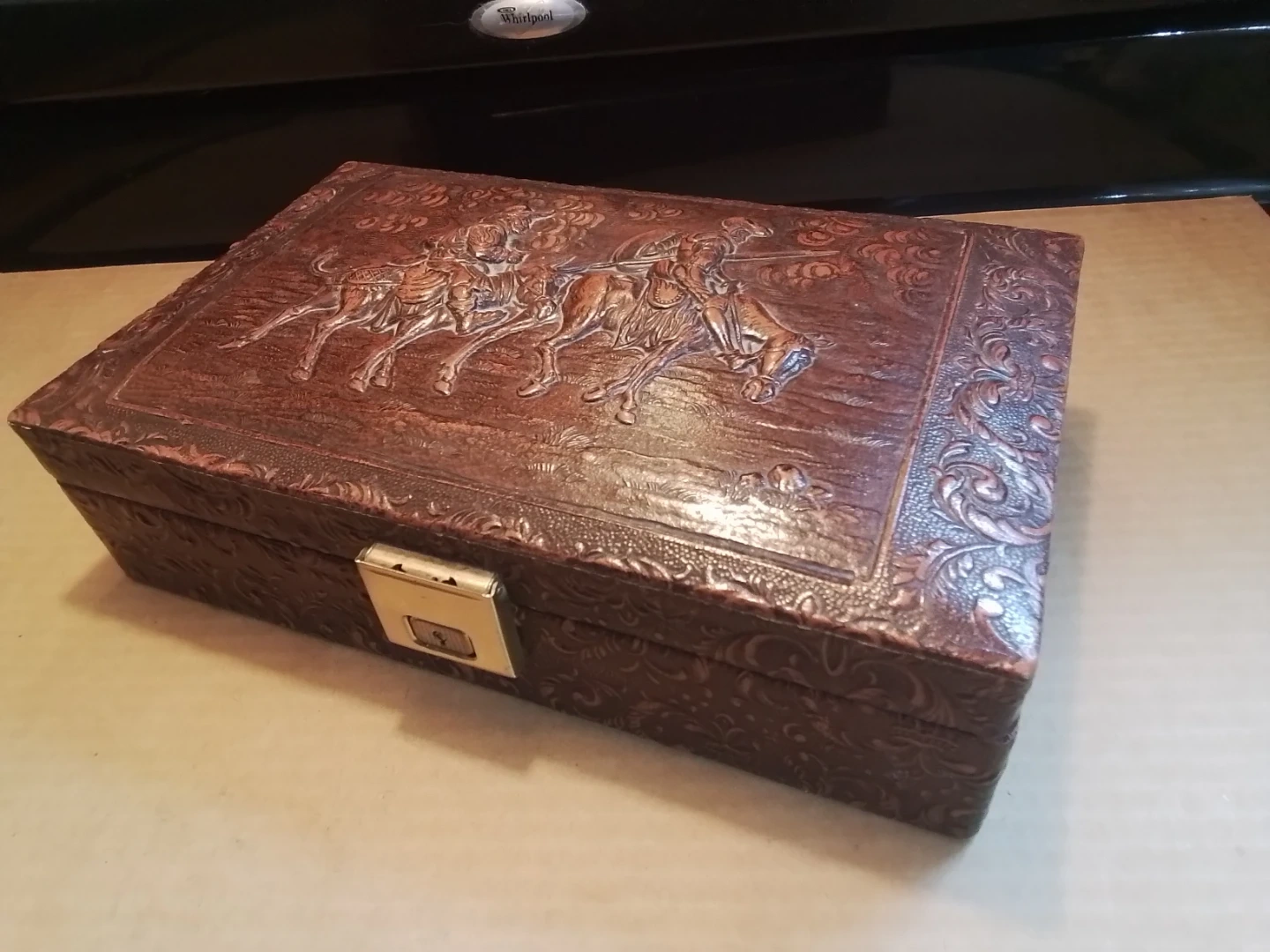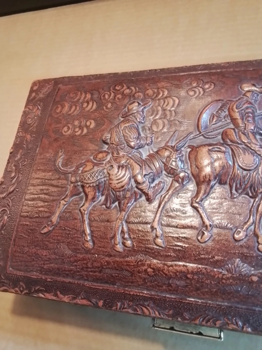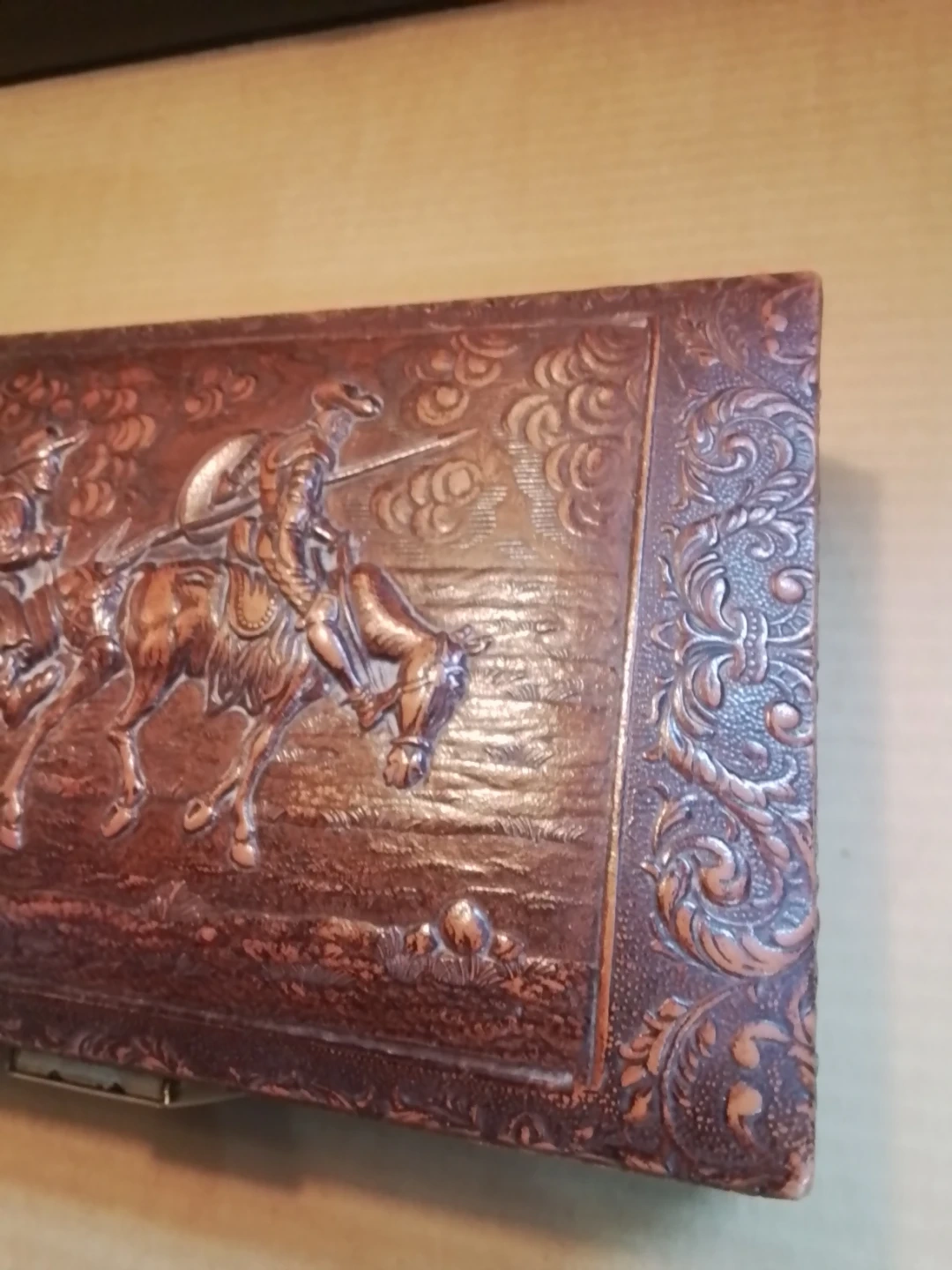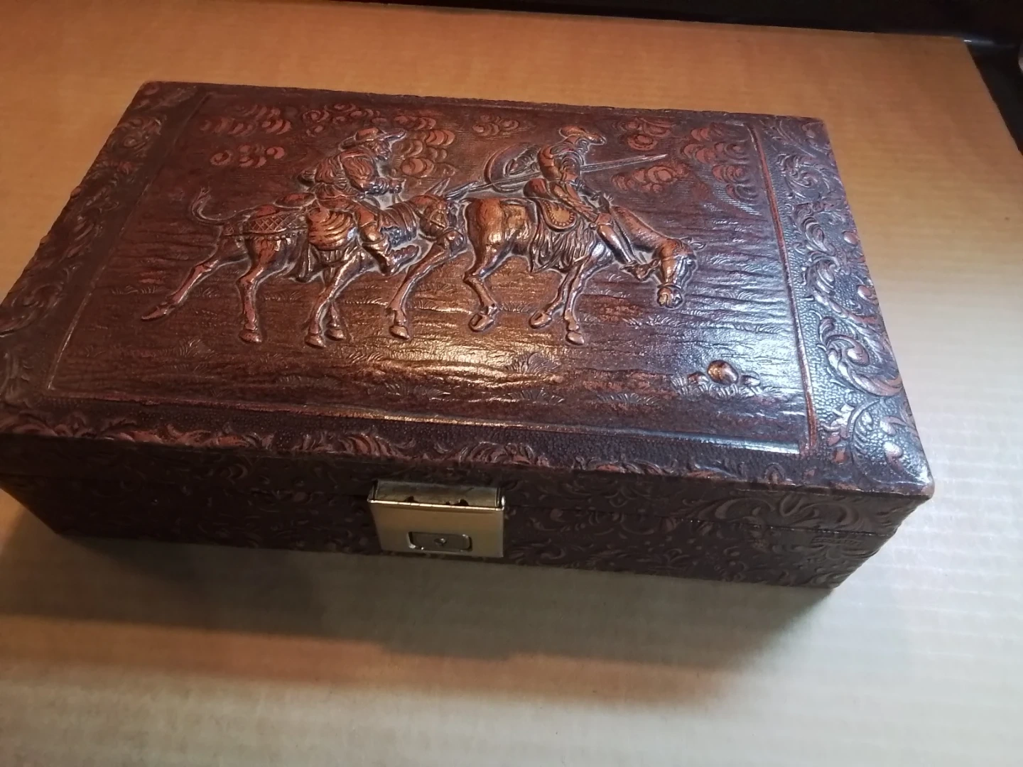 This vintage trinket box features an embossed western scene with cowboys on horses. It has a decorative patterned exterior and a brass-toned latch closure. Ideal for storing small keepsakes or jewelry.