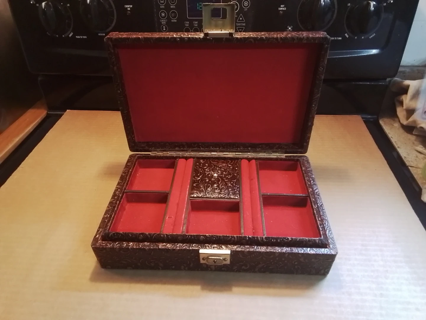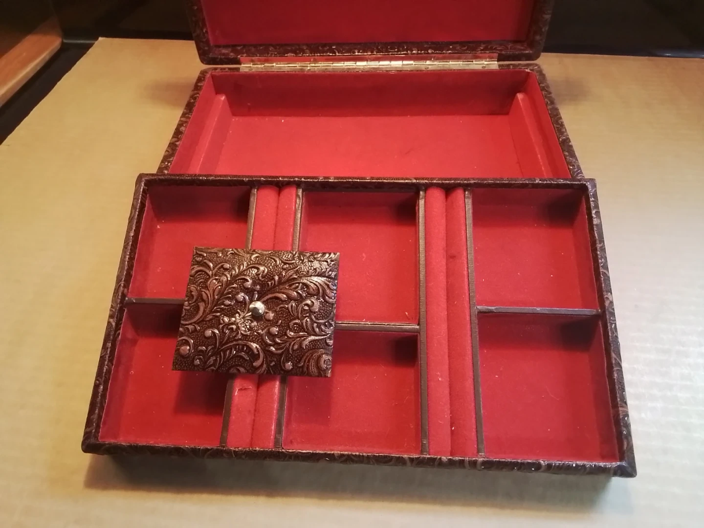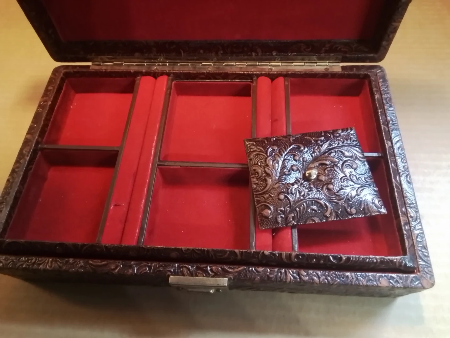 This is a pre-loved vintage leather jewelry trinket box, sized at 11.5x7x3 inches, perfect for storing your treasured items with a touch of rustic charm. It features a unique embossed design with a red felt lined interior divided into 6 compartments. This box shows signs of use but remains fully functional and aesthetically pleasing.