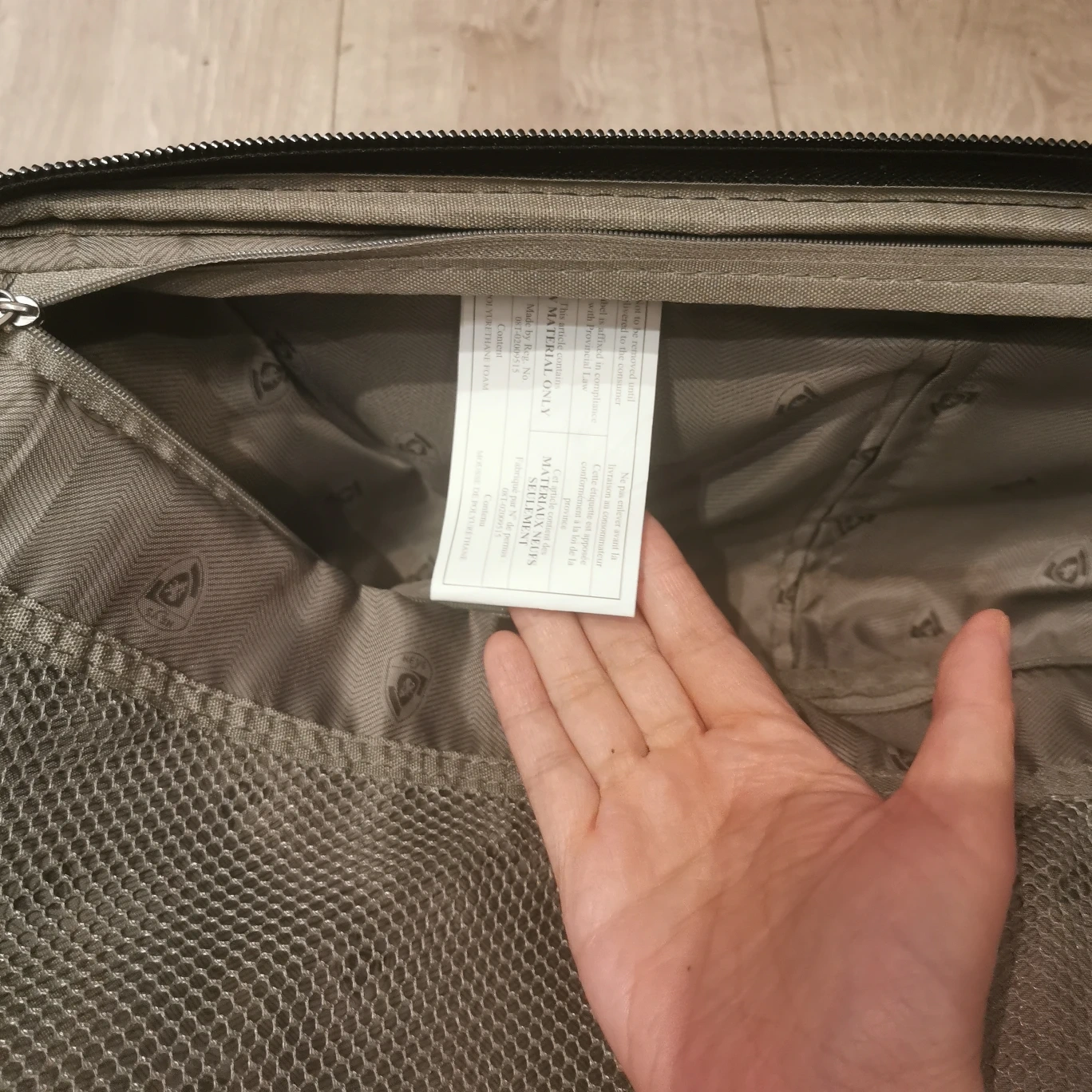 Large hard shell suitcase. Four spinner wheels. TSA-approved lock. Interior zippered compartments. Durable construction. Great for travel.