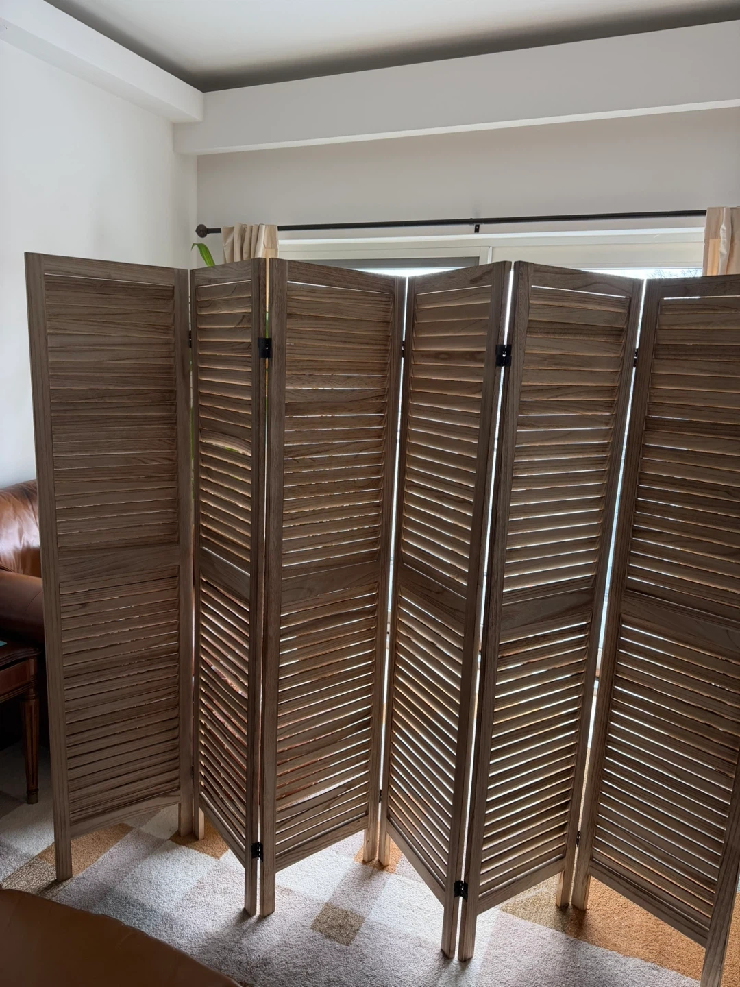 This 6-panel room divider features a slatted wood design. It's perfect for creating privacy or defining spaces in your home. The panels are hinged for easy folding and storage.