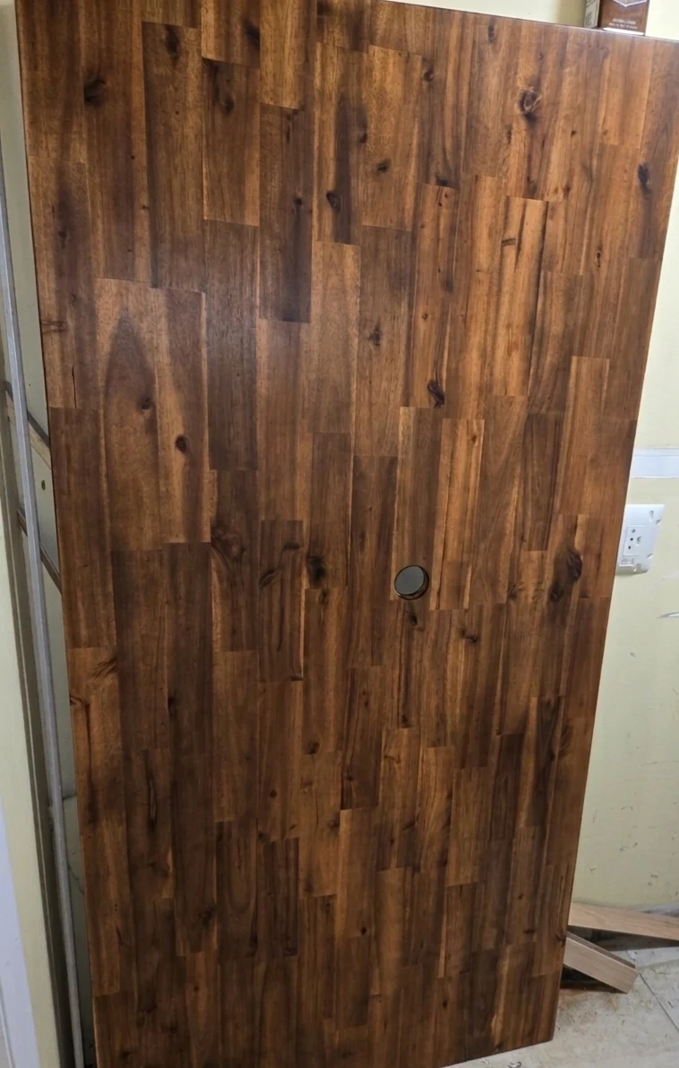 A solid wooden door panel with a rich, dark wood grain finish. It features a pre-drilled hole for hardware. This panel would be great for a DIY project or replacement.