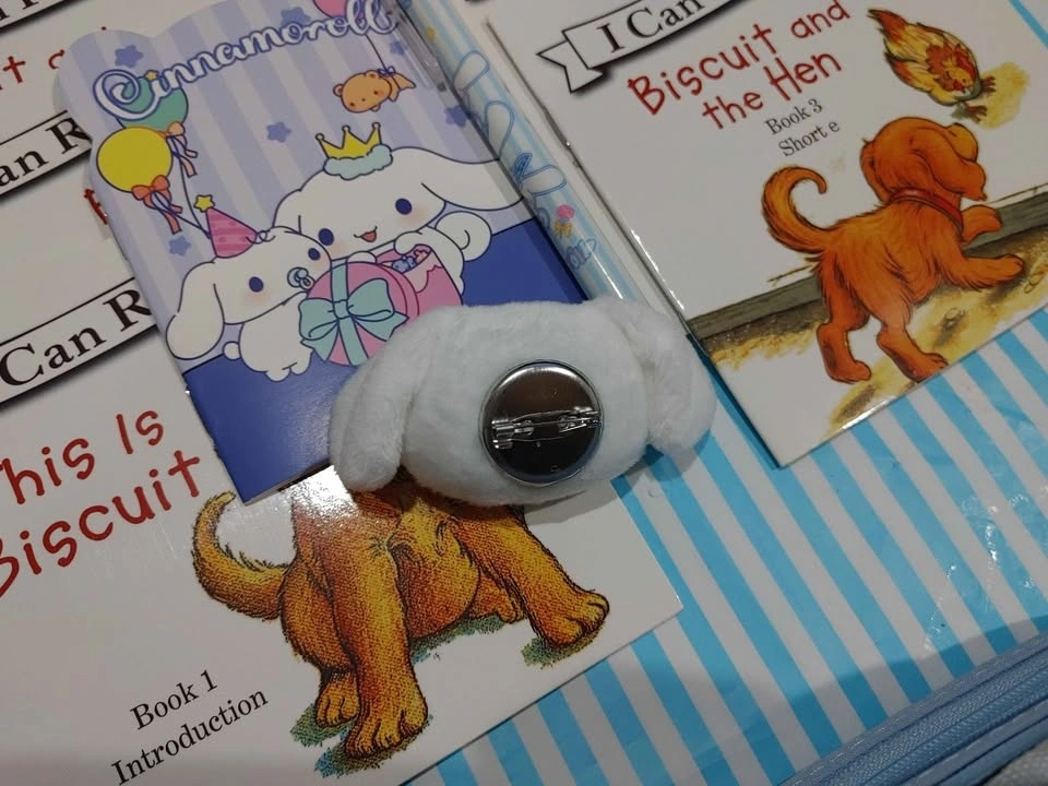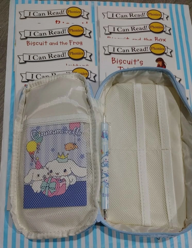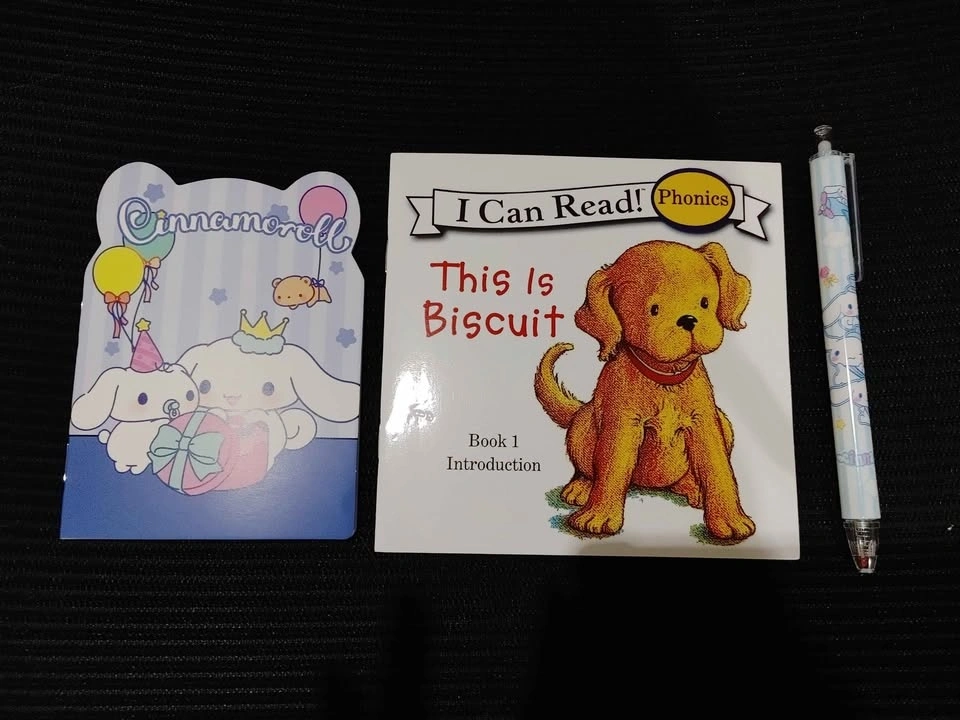 Set includes: "I Can Read! Phonics' books featuring Biscuit the dog. 12 compact books. Mini Cinnamoroll set: pin, small notebook, pen, multi-purpose case with 3 compartments. Pick up at Killarney Community Center at 6260 Killarney St, Vancouver, BC.