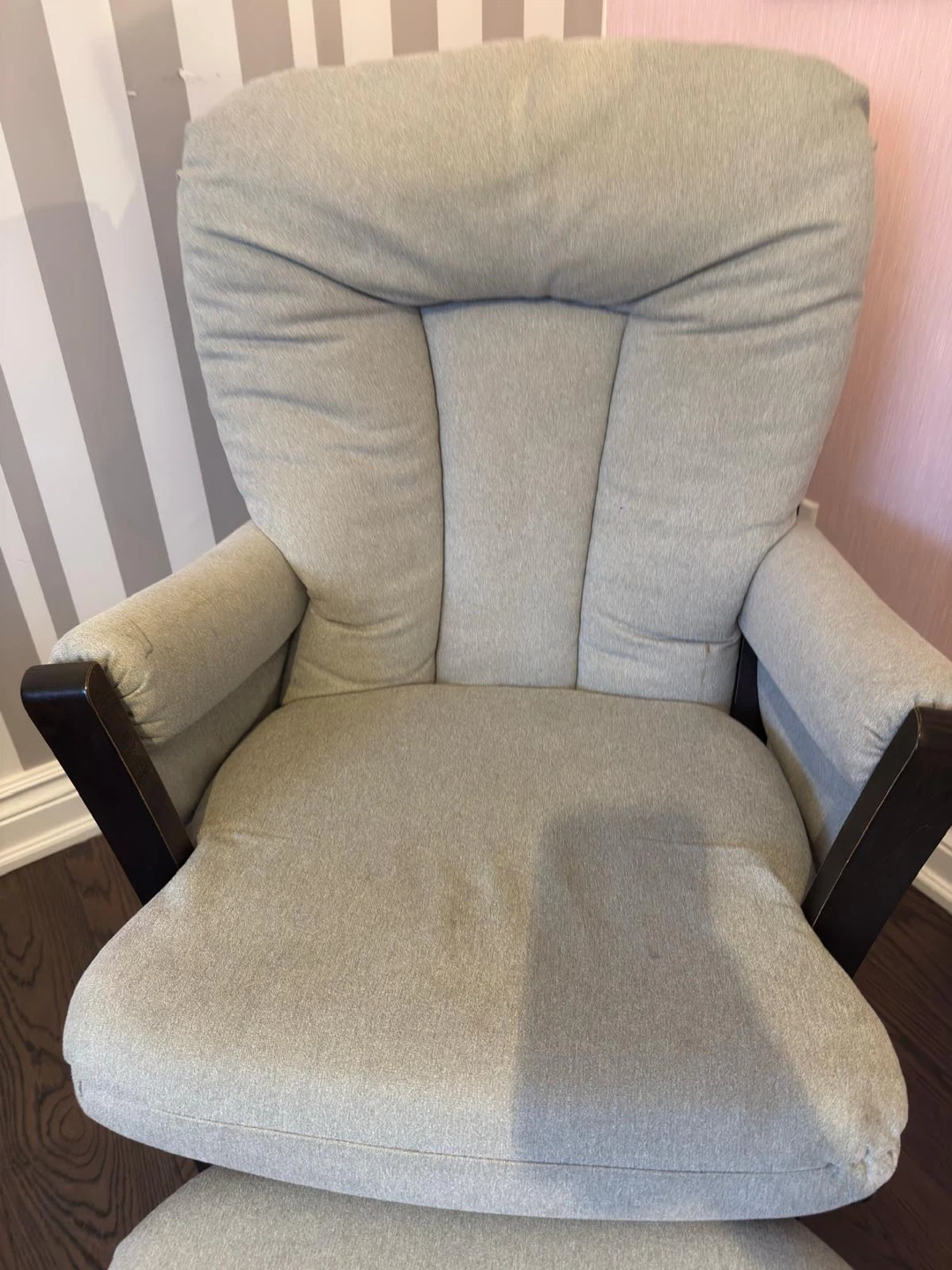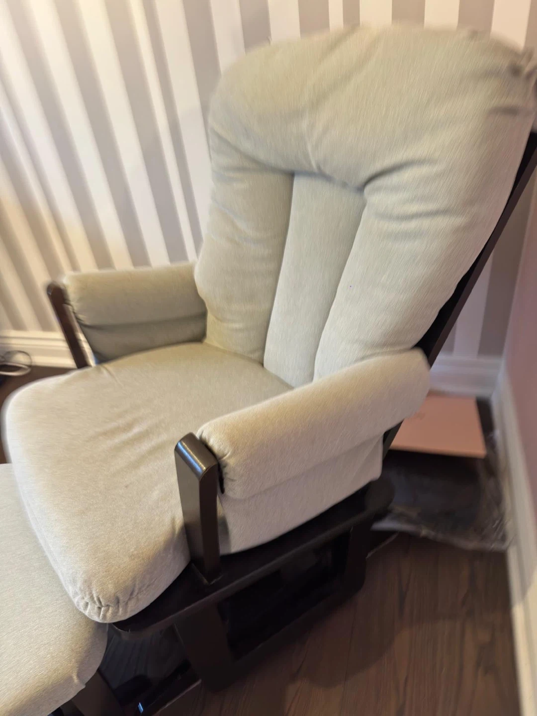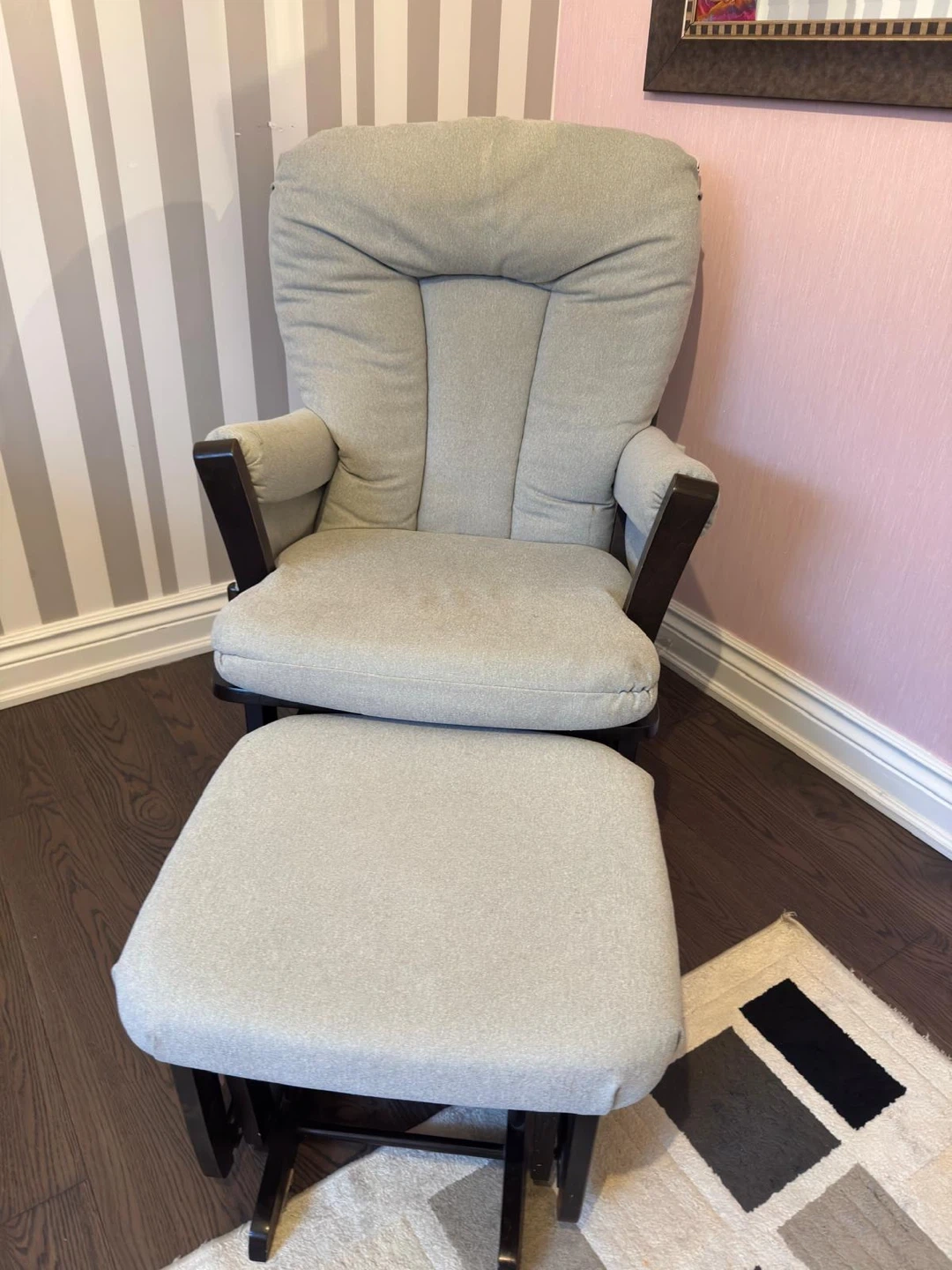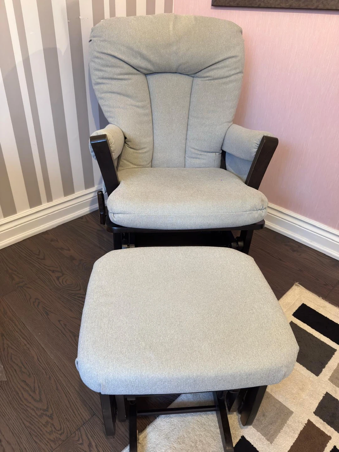 Comfortable glider chair with matching ottoman. Features a plush upholstered seat and back, with wooden armrests. Perfect for a nursery or living room. Gently used and in a very good shape. Comfortable. $180 or best offer