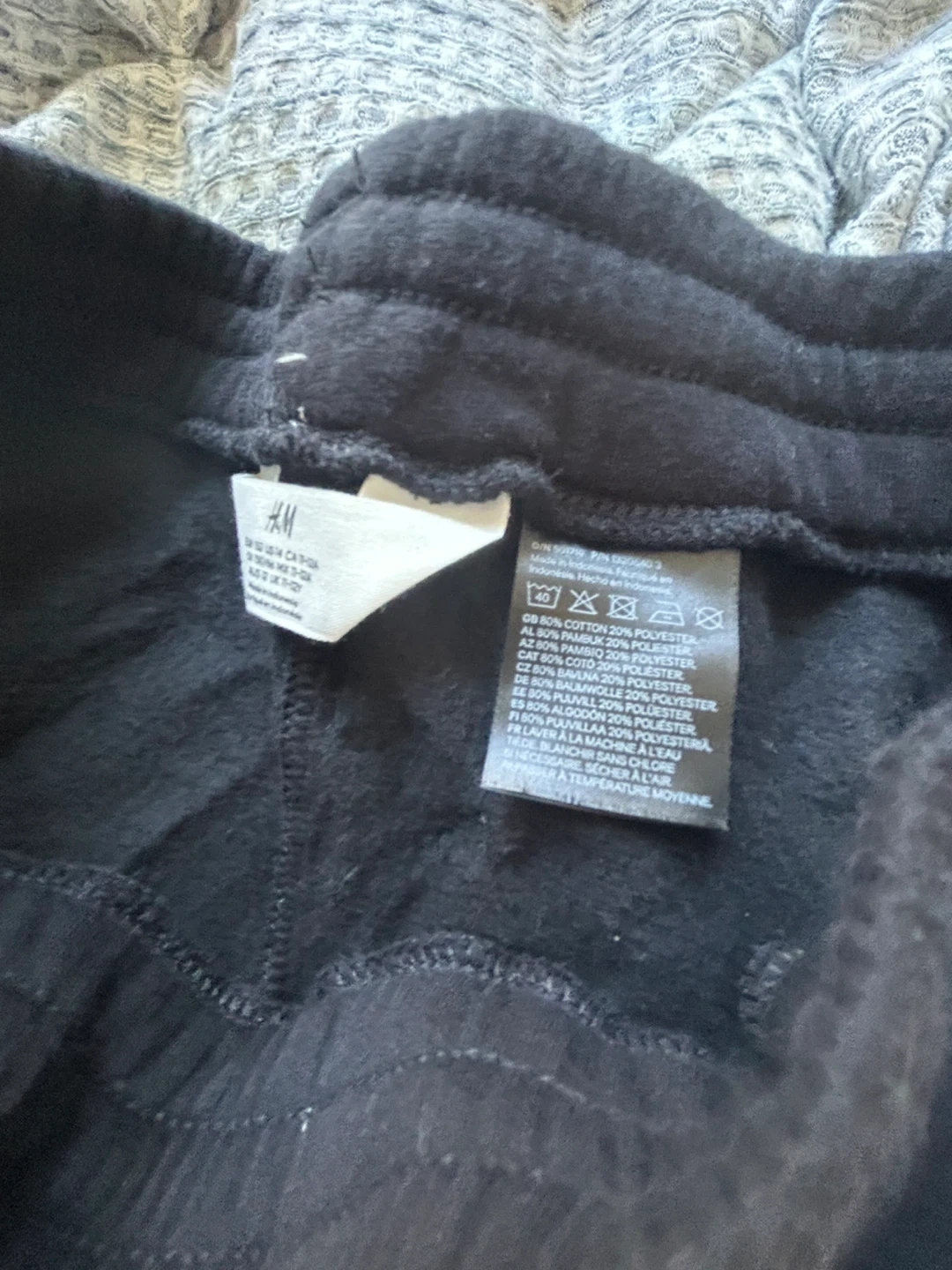 Two pairs of H&M kids sweatpants. Grey pair is size 12-14Y, black pair is size 11-12Y. Both are made from a cotton-polyester blend.