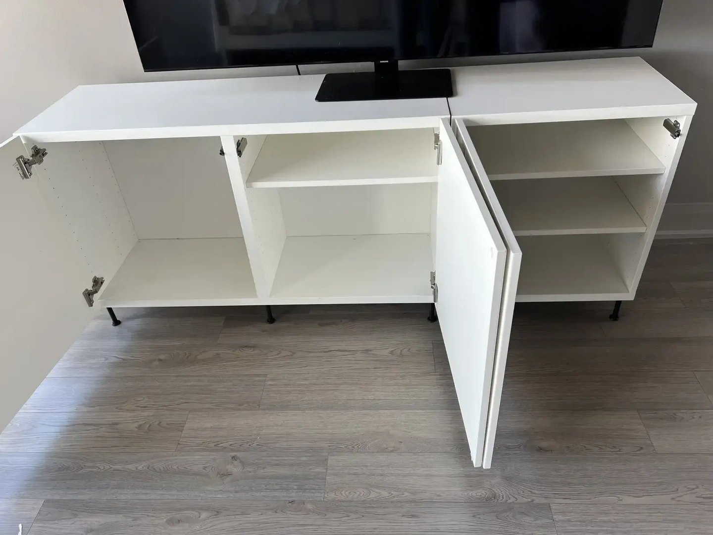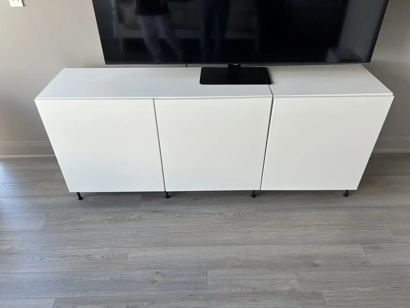 This unit features a clean, modern design with spring push-open doors (no handles), making it perfect for a minimalist or Scandinavian-style space. The stand is sturdy, clean, and well cared for, with no damage, scuffs, or visible wear.