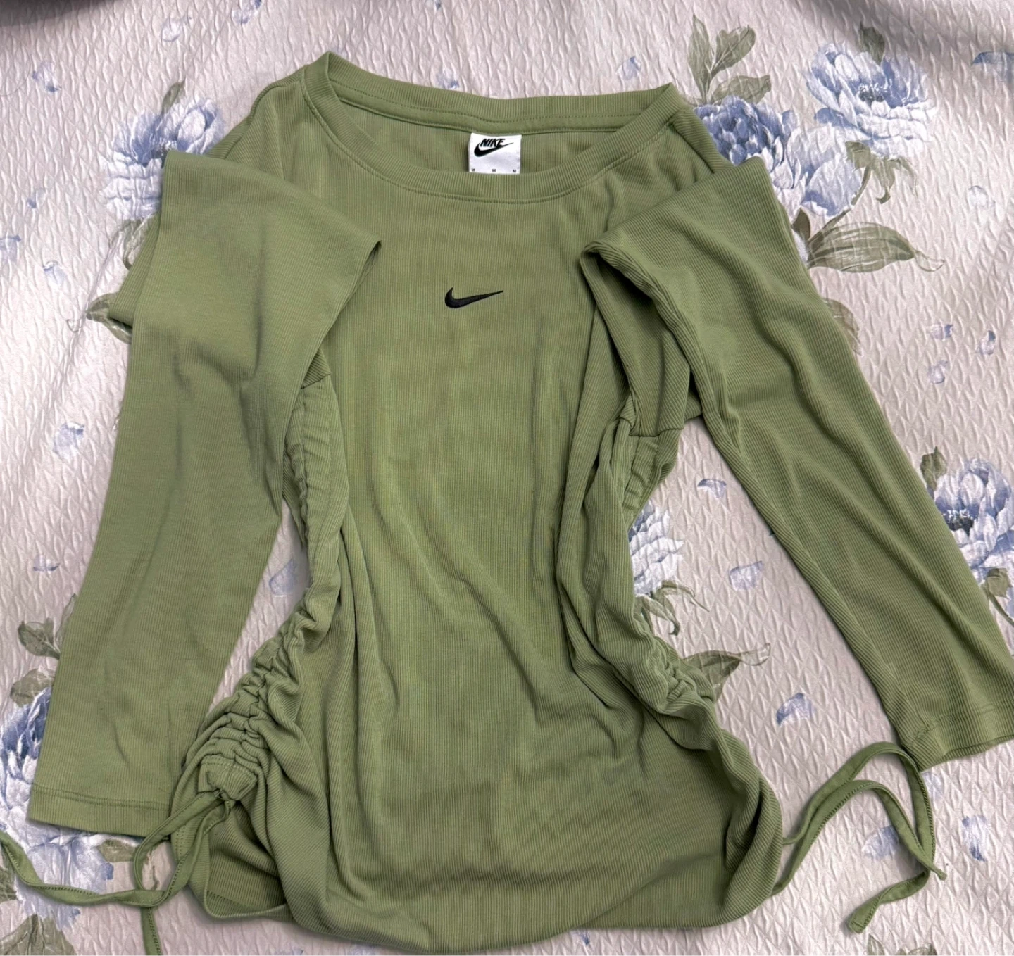 Nike women's ribbed long sleeve top in an olive green colour. It features a black embroidered Nike swoosh logo on the chest and adjustable drawstring ruching on the sides. A stylish top for casual wear! SIZE MEDIUM