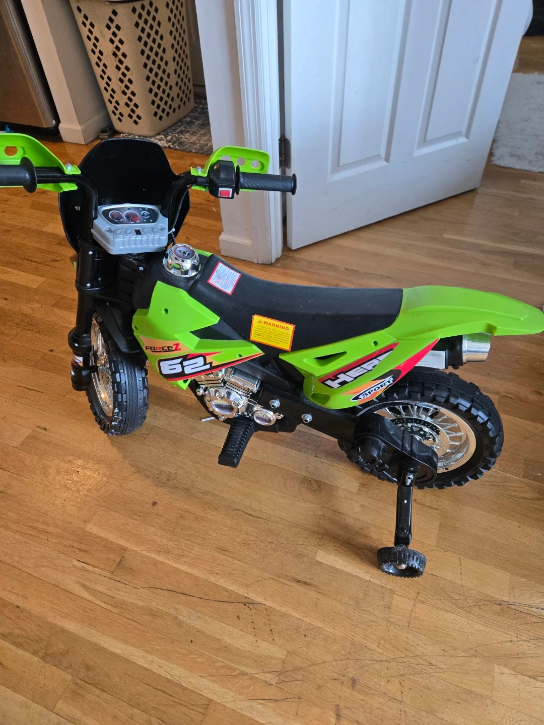 This is a fun green and black ride-on toy motorcycle. It has 'MOUNTAINBIKES' printed on the front. Comes with training wheels for stability. Great for outdoor play! Used only a month indoor.