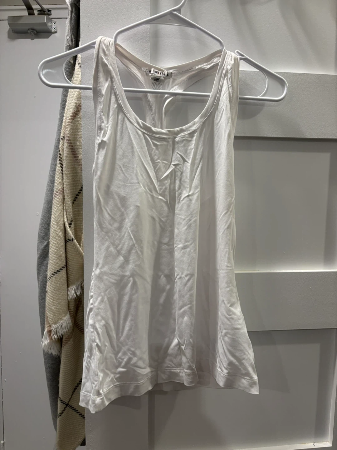 A basic white racerback tank top from Forever 21. It's made from a soft, stretchy material. This tank is great for layering or wearing on its own.
