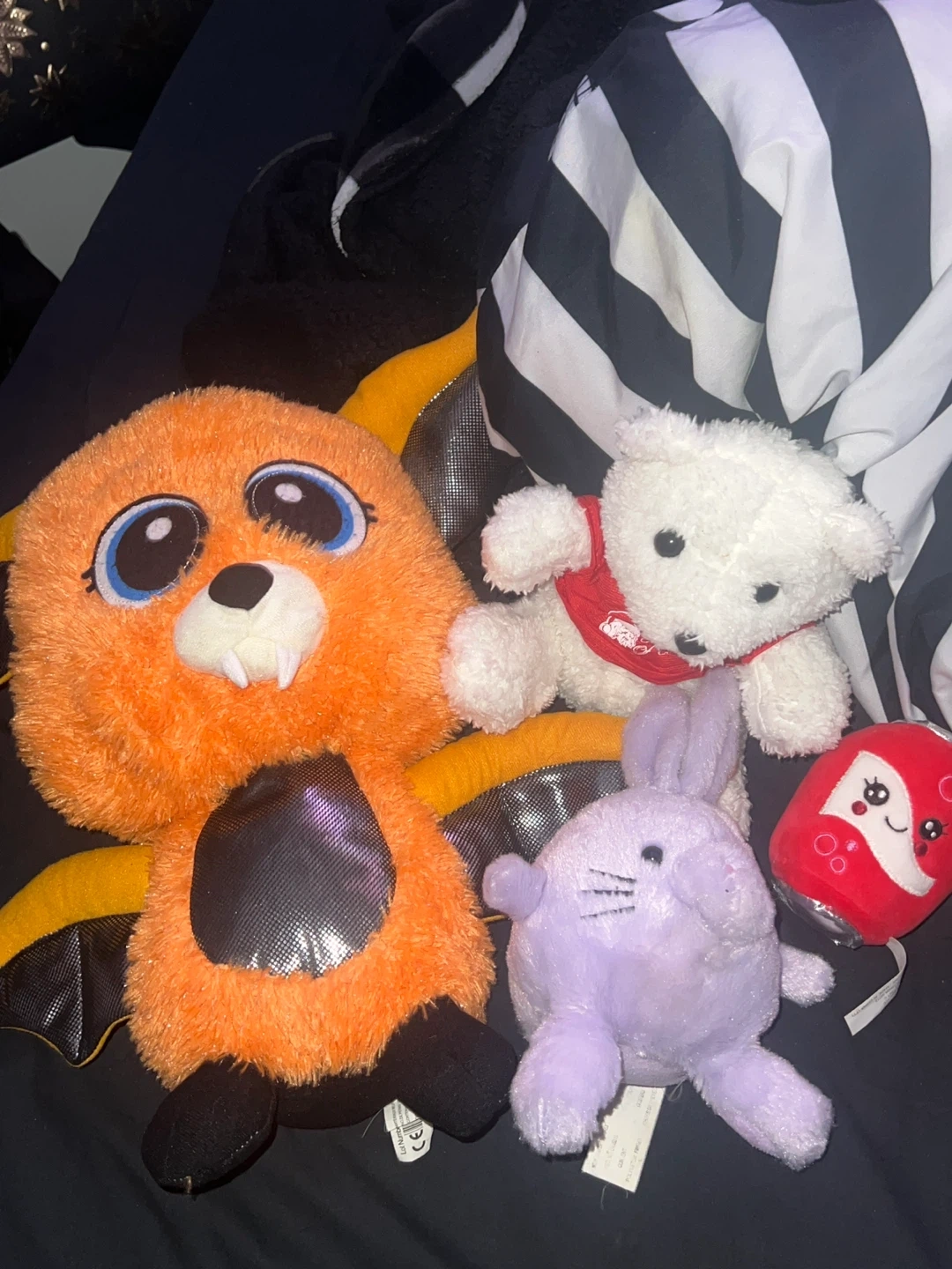 Selling a collection of cute plush toys! Included are an orange bat with wings, a white bear wearing a red vest, and a soft purple bunny and a plush soda can. Perfect for kids or collectors!