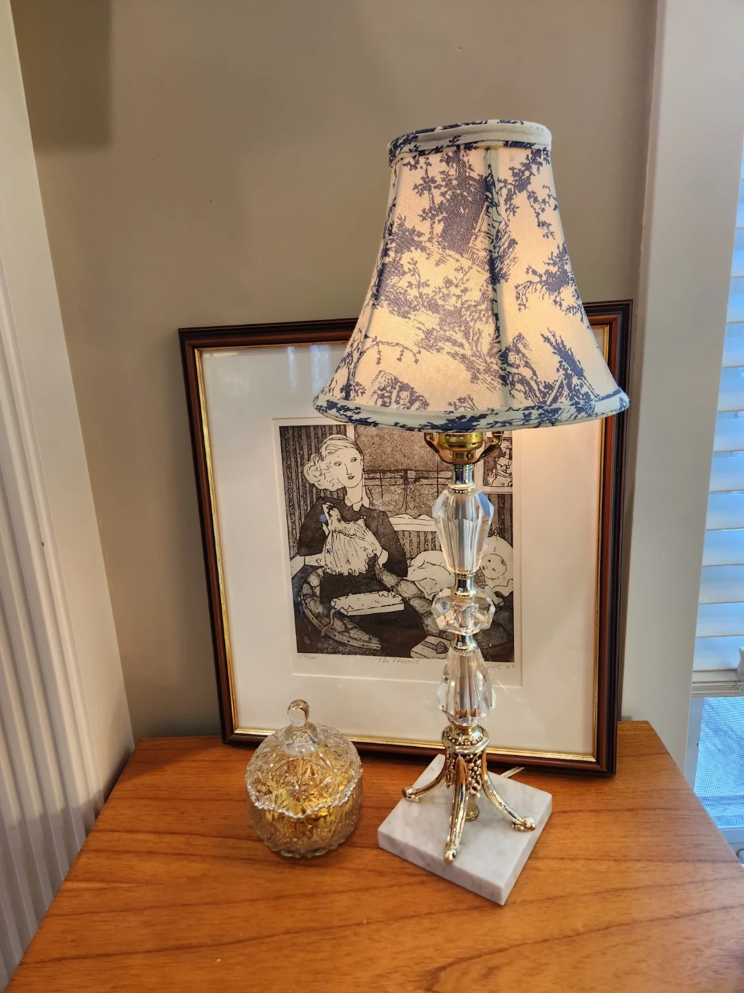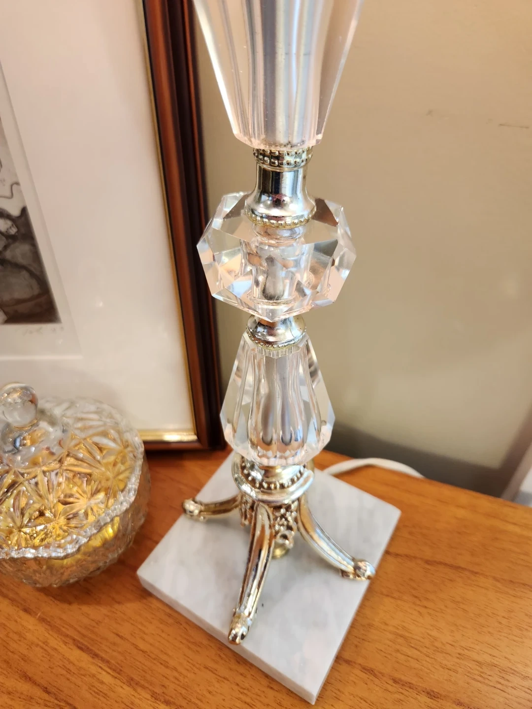 This elegant table lamp features a crystal-look base with metallic accents, and marble base. It's topped with a charming classic tole fabric shade. A great accent piece for any room!