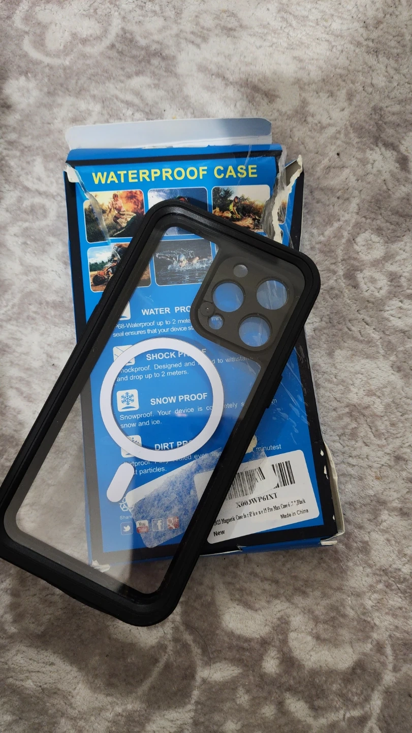 This is a 2023 magnetic waterproof case for an iPhone 15 Pro Max. It's black and designed for shockproof and snowproof protection. The case is made to withstand submersion up to 2 meters.