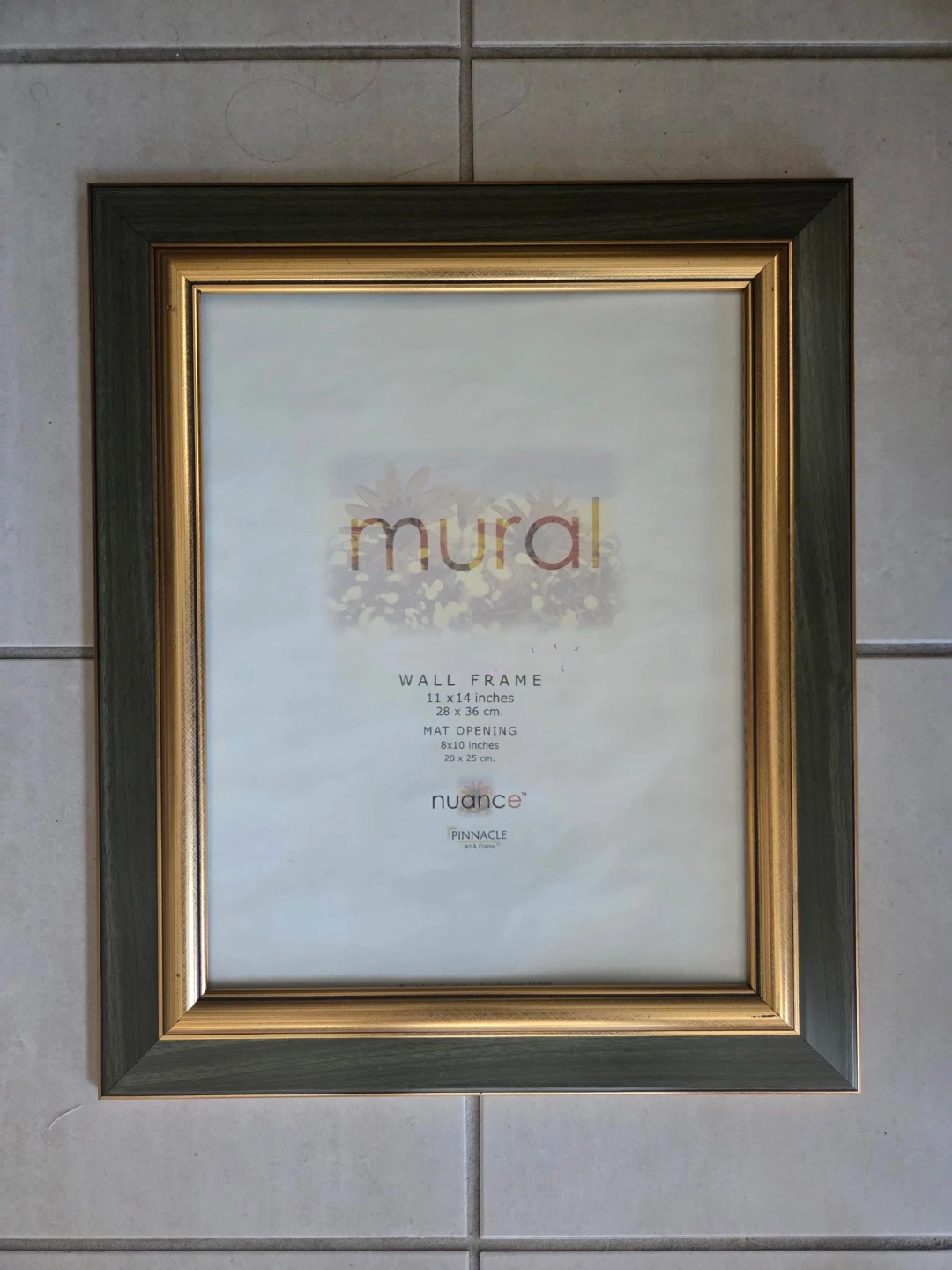 Nuance wall frame for photos. It fits an 11x14 inch display with a mat opening of 8x10 inches. Frame has a gold and dark green finish. Includes backing and hangers.