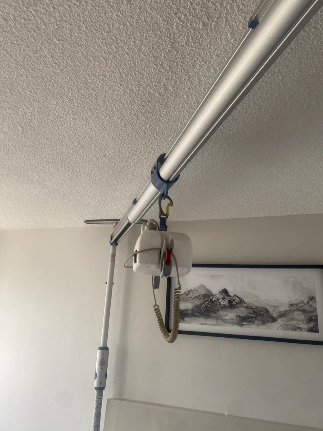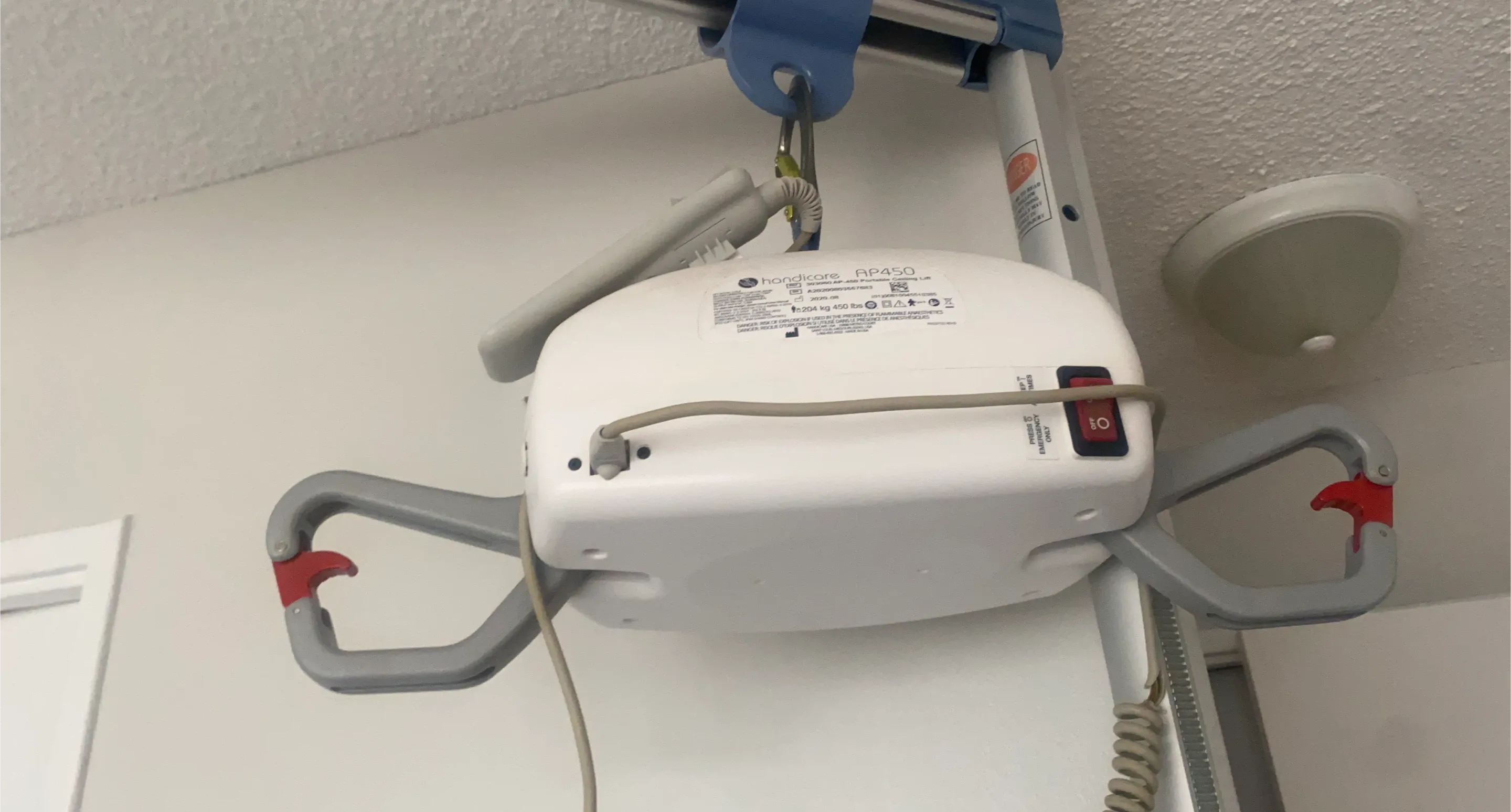 This is a Handicare RP450 patient lift. It has a lifting capacity of 450 lbs (205 kg). It's a ceiling-mounted system for patient transfer. This lift is designed for home care use.