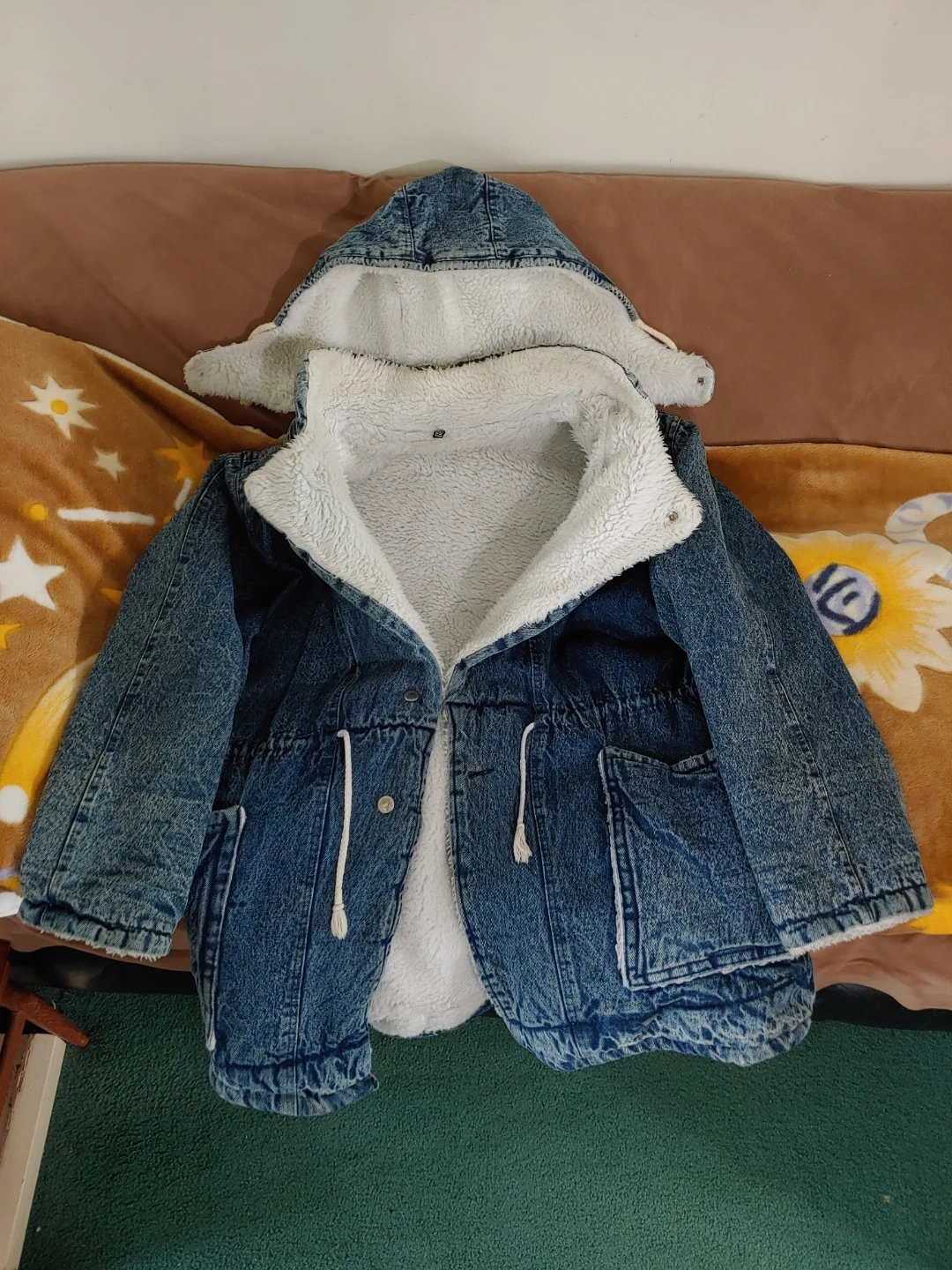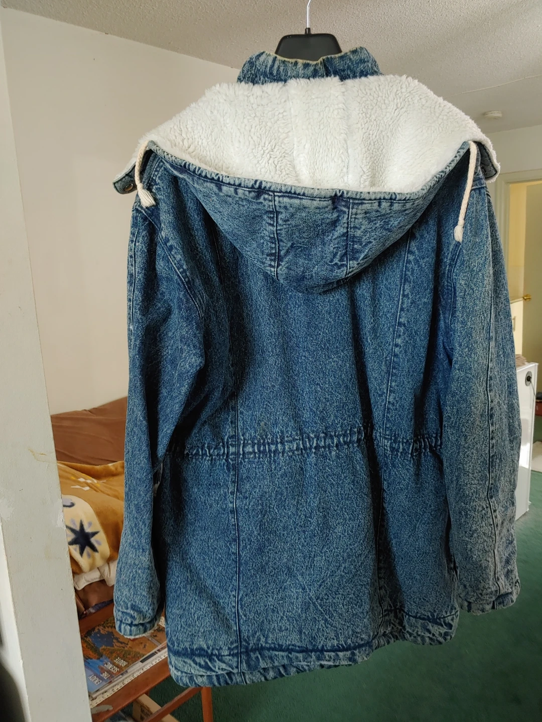 Cozy denim jacket with a sherpa lining to keep you warm during the colder months! It's a size L to XL and features a hood and drawstring waist. Perfect for body protection from cold!