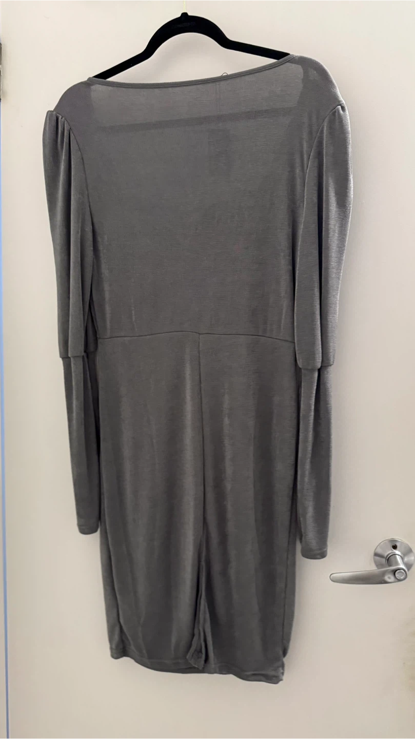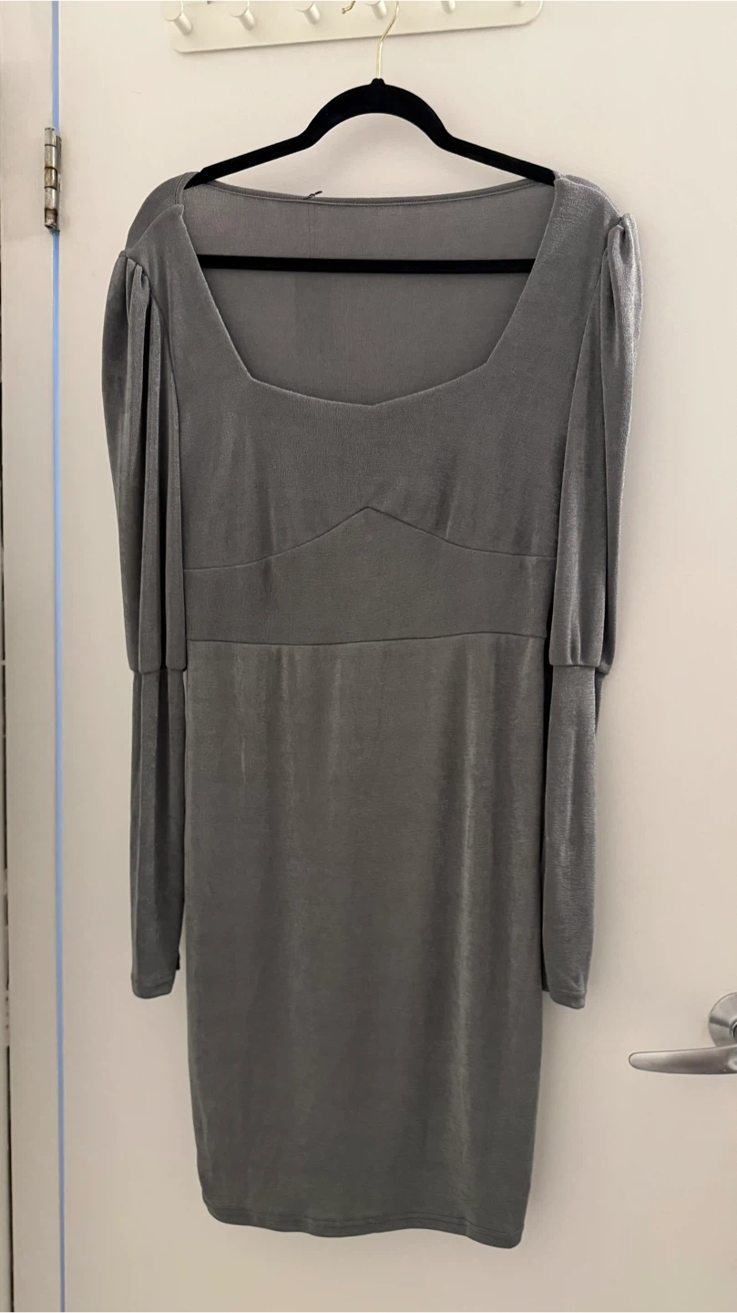 This grey long sleeve dress features a sweetheart neckline and puffy sleeves. It's a stylish option for a night out or a special occasion. Material is soft and flowy.