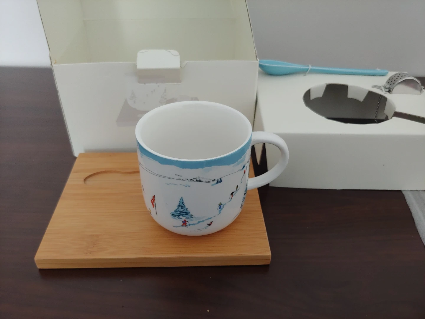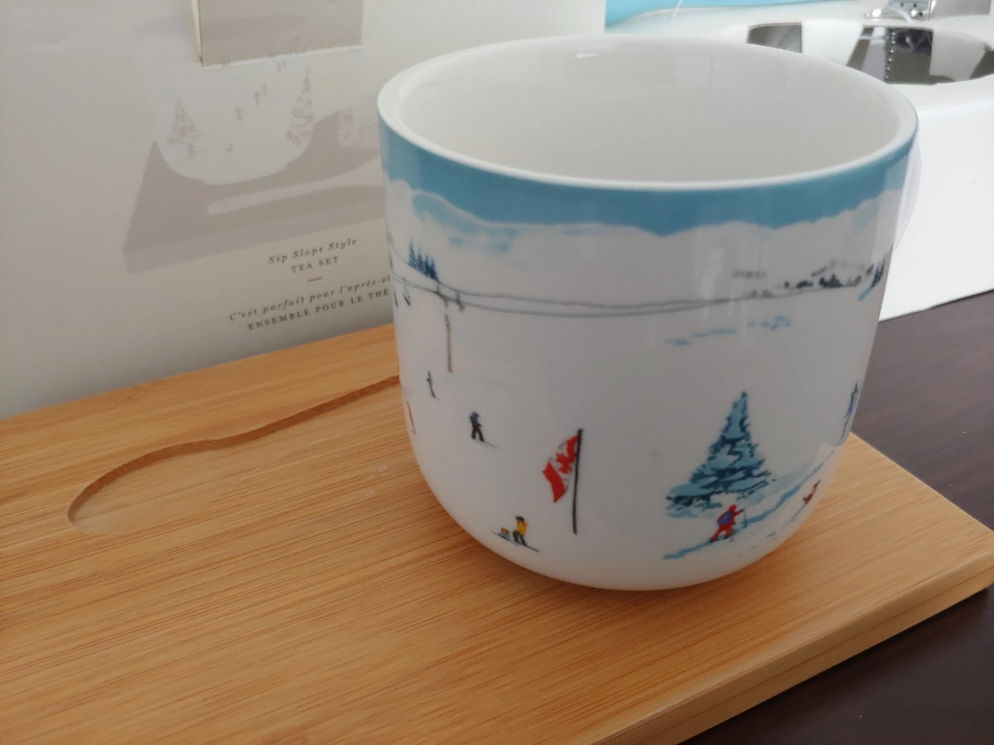 Selling a brand new Indigo Ski Scene Tea Set! It includes a wooden tray, mug, and infuser, all in the original box. The mug features a cute winter ski scene with Canadian flags.