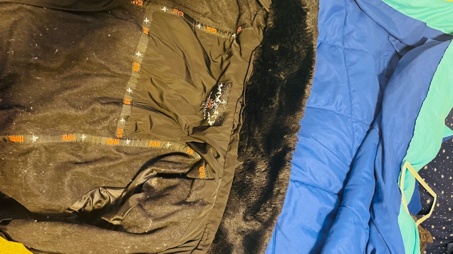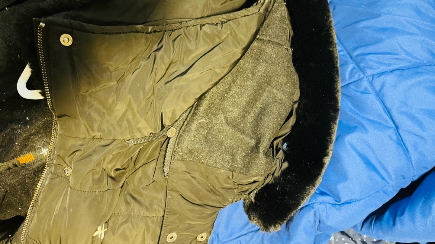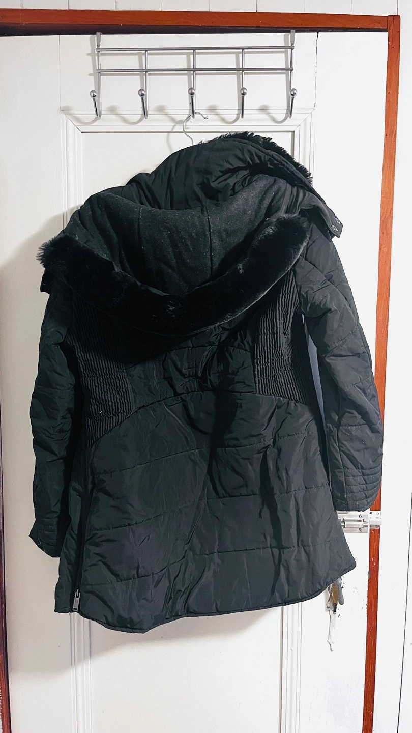 Black winter jacket with detachable faux fur hood. Zipper and button closure. Has pockets. Lined with fleece. Perfect for -40C. Perfect for Canada winter. Fits perfectly for a small and medium person.