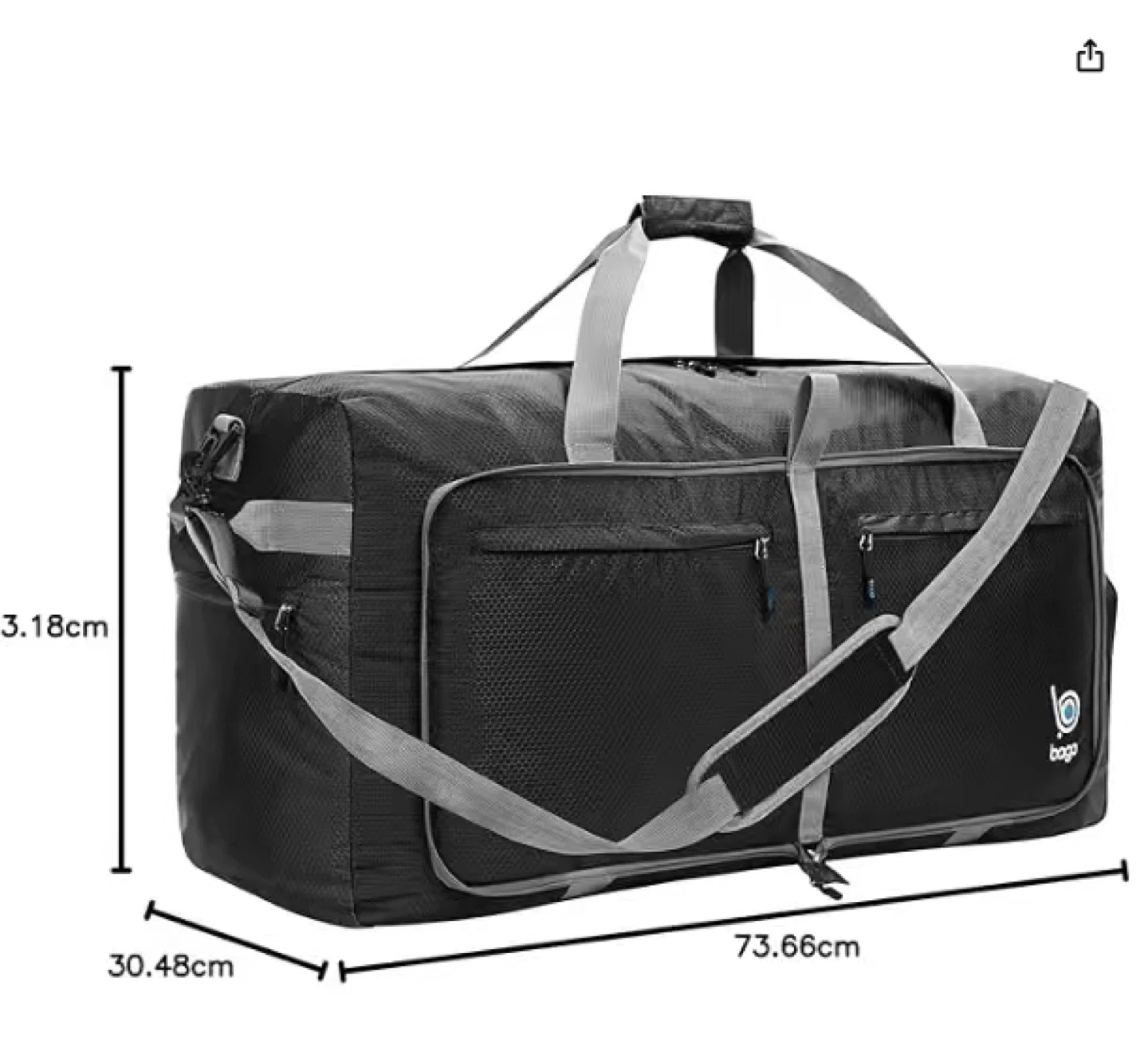 This Bago duffel bag is made with water-resistant fabrics. It has a large 100L capacity and comes with a padded shoulder strap. The bag includes side, front, and internal pockets for organization, plus a separate compartment for shoes or laundry.