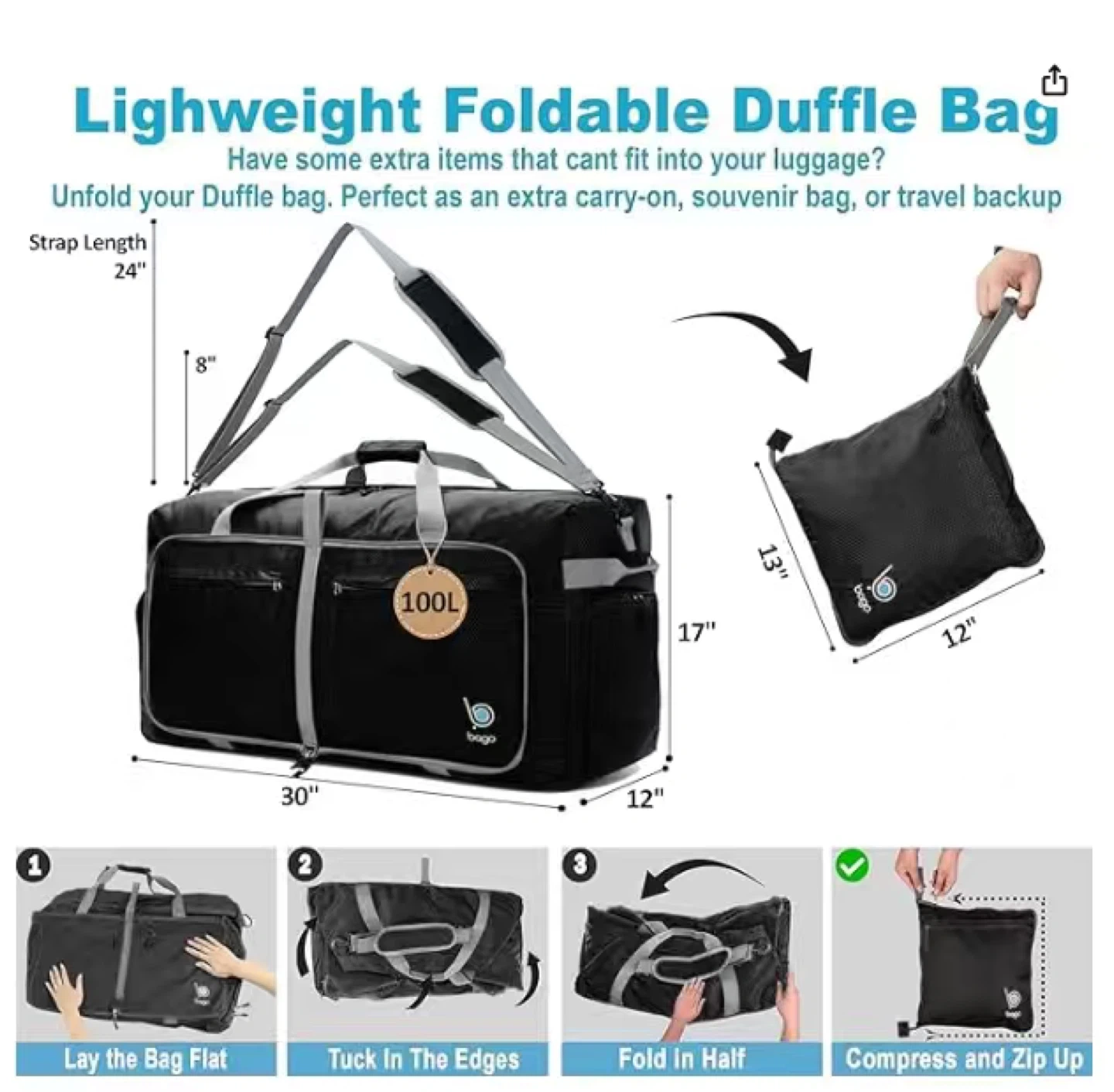Bago Large Foldable Duffel Bags for Traveling - 100L Packable Duffle Bag for Travel with Shoe Compartment - Water Repellant, Heavy Duty, Lightweight Folding & Collapsible