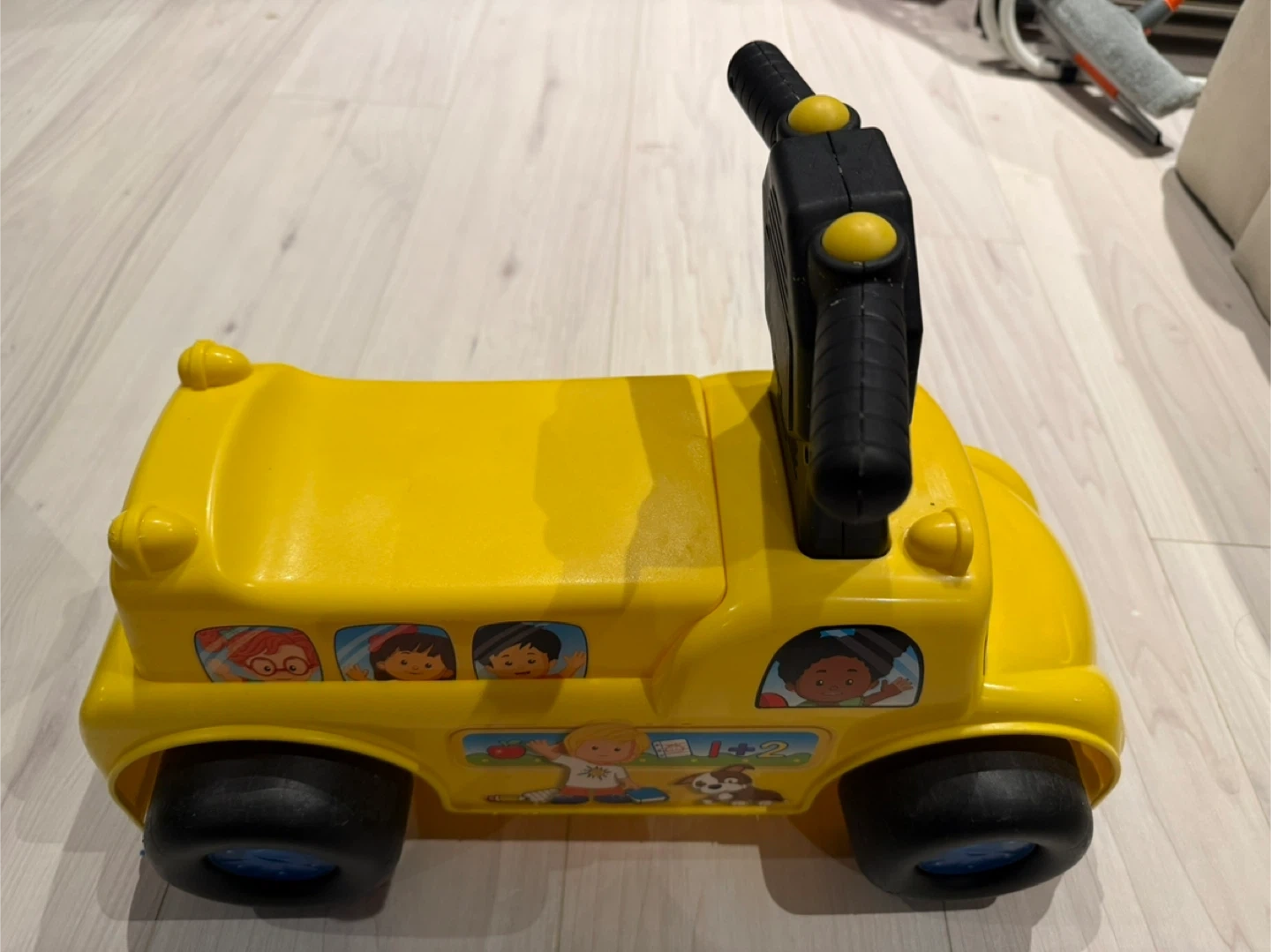 Yellow Little People school bus ride-on toy. It has colourful decals of children and a dog. This ride-on toy is designed for young children to push or ride on. It's great for developing gross motor skills!