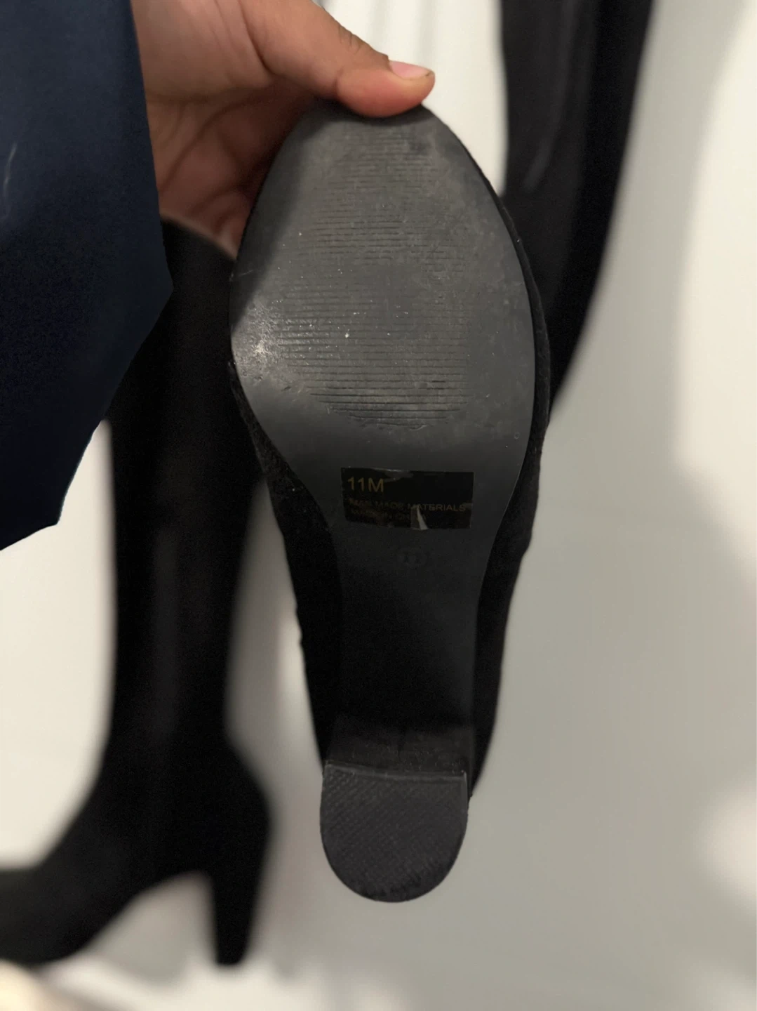Stylish black over-the-knee boots with a side zipper and block heel. Man-made materials. Size 11.