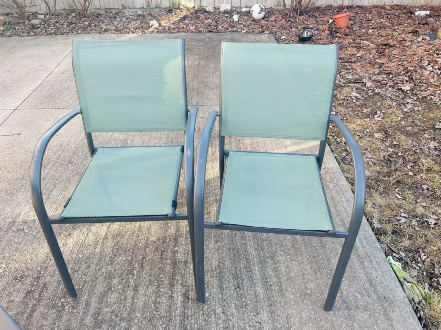 This is a set of outdoor patio furniture including one rectangular table and two chairs. The table is dark grey with a metal frame and has an opening for an umbrella. The chairs are also dark grey with light green fabric seating and backrests. Metal frame construction. Great for a backyard or patio space!