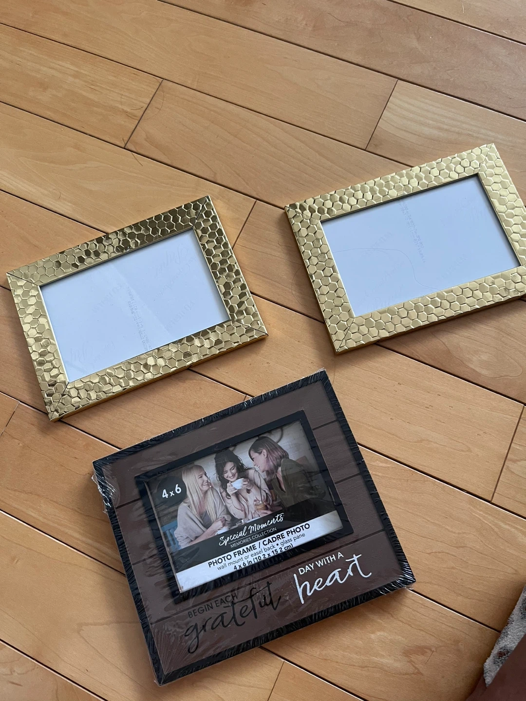 This set includes two gold honeycomb patterned photo frames and one brown "grateful heart" photo frame. The brown frame is for a 4x6 inch photo and measures 4x6 inches (10.2 x 15.2 cm). It can be wall mounted or used as an easel back.
