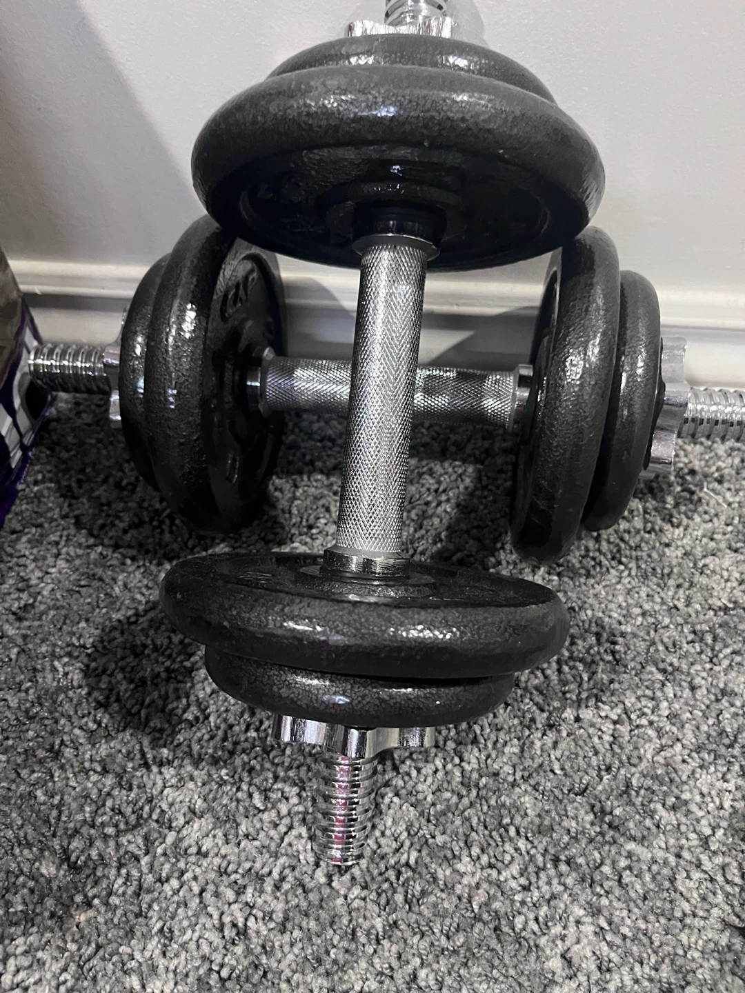 Black cast iron dumbbell plates with chrome handle and spin locks. Weights are adjustable to suit your workout needs. These are great for home gym workouts!