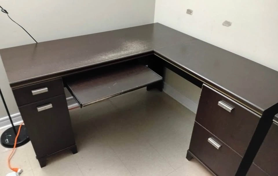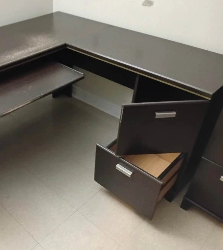 The left and center piece measures 5' wide x 23" deep x 30" high, featuring a keyboard tray, a small drawer, and a tall cupboard for a computer tower.