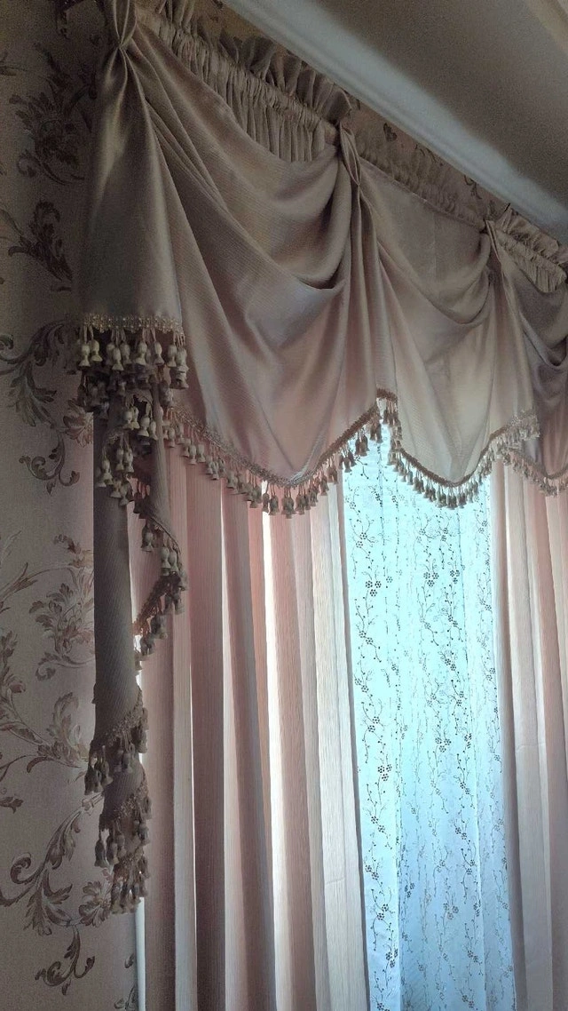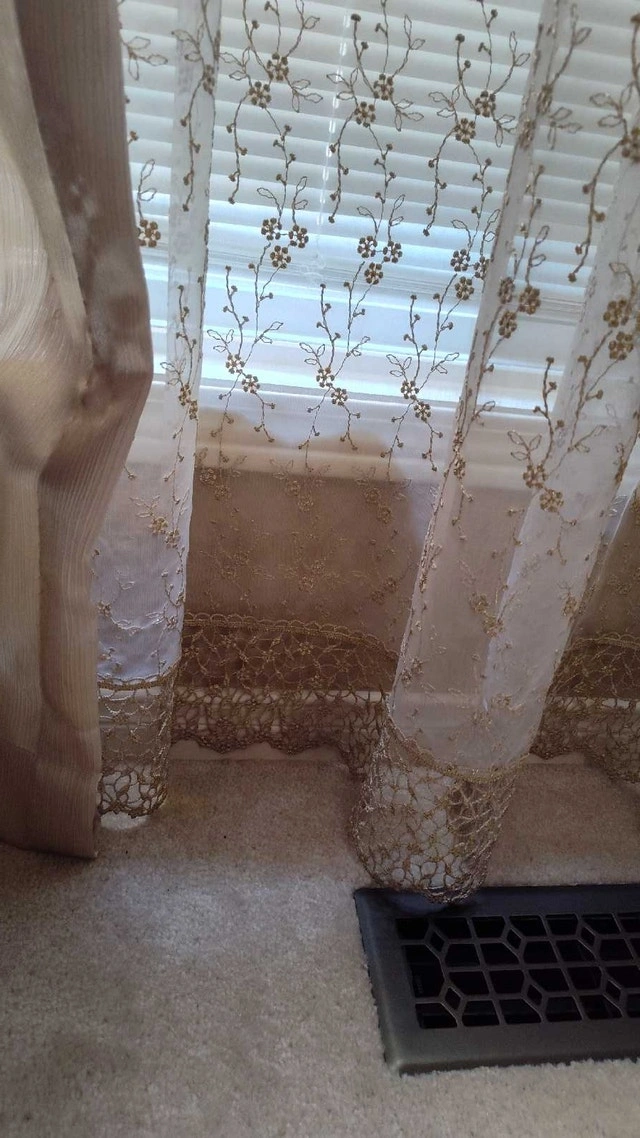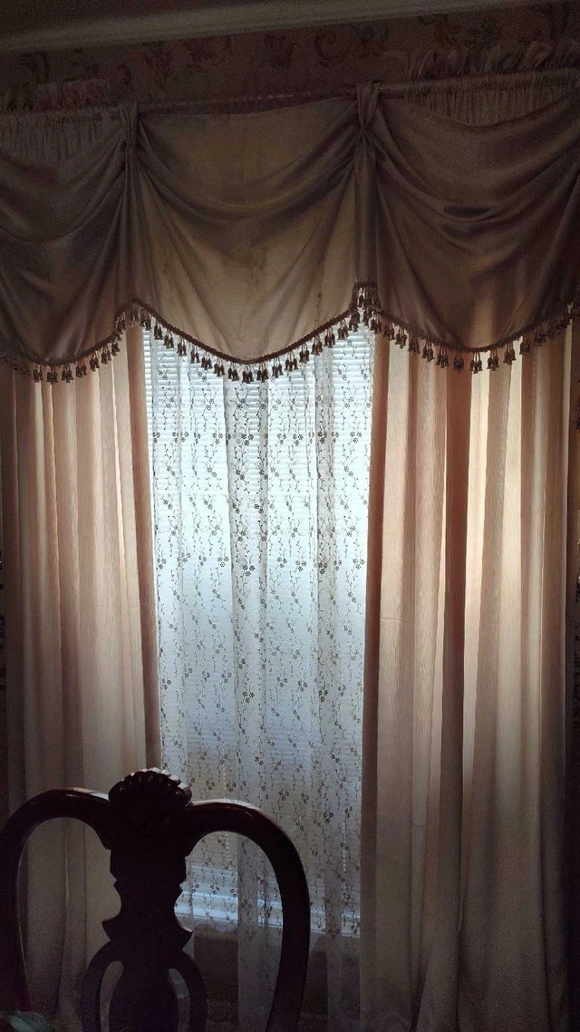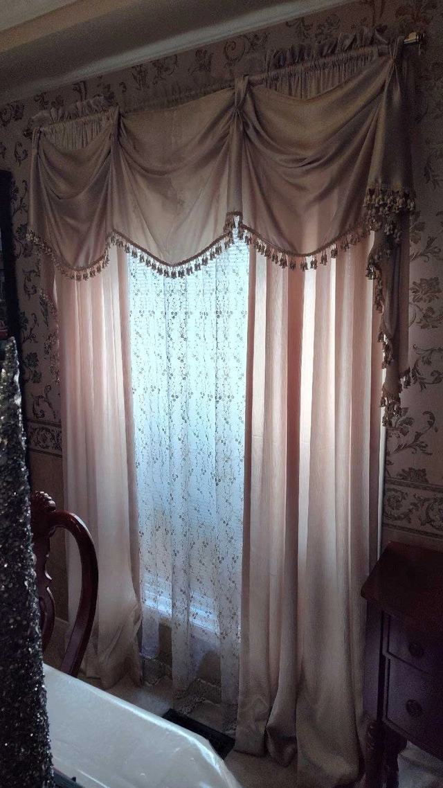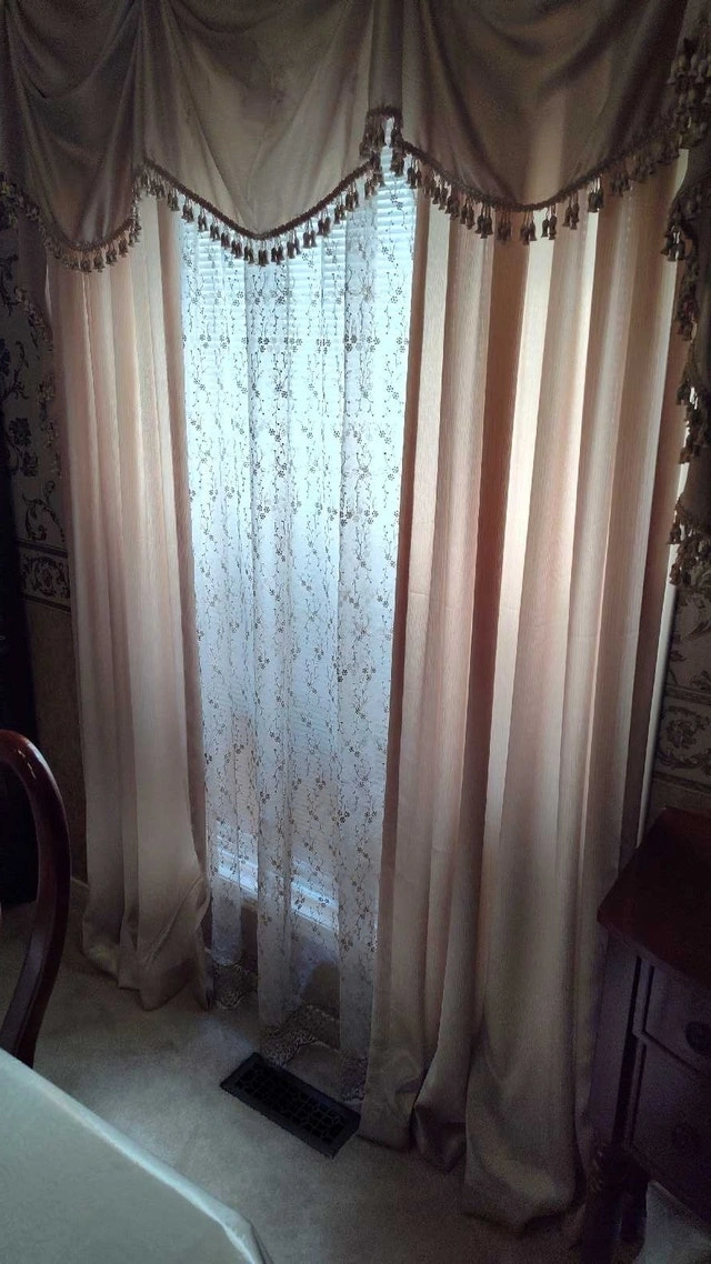 Add a touch of elegance to your home with this beautiful, used curtain set, featuring a stylish valance and delicate sheers. The intricate detailing and soft fabric create a warm and inviting atmosphere in any room. Set includes: Valance and sheer curtains. Colour: Beige and gold. Style: Traditional with beaded trim. Condition: Gently used, in good condition. These curtains have been well-cared for and are ready to adorn your windows with sophistication. Cash accepted.
